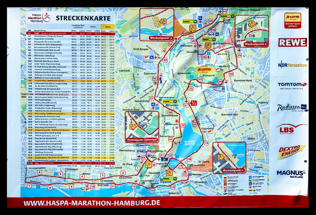 Als ich dann meinen gut gefüllten Startbeutel zusammen mit meiner Startnummer in den Händen hielt, schaute ich mir im Detail noch einmal die Strecke an. Hamburg kannte ich eigentlich ganz gut. Einige Läufe dort und meine Arbeiten führten mich doch bereits sehr oft in diese Stadt hoch im Norden. Ich freute mich besonders auf den Hafen, Eppendorf und Rotherbaum.