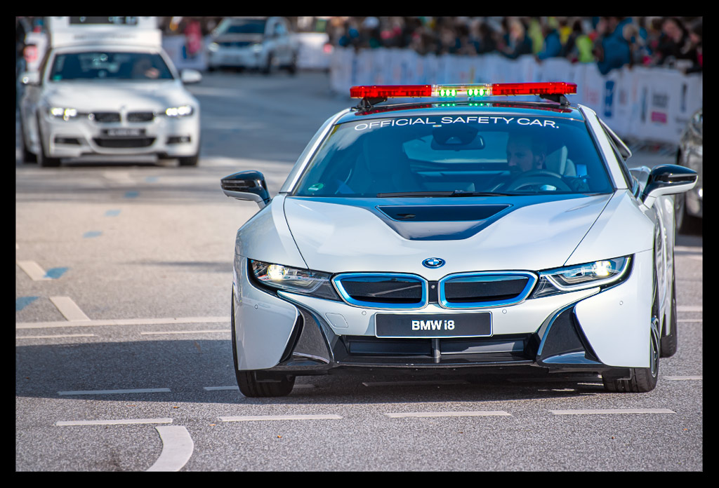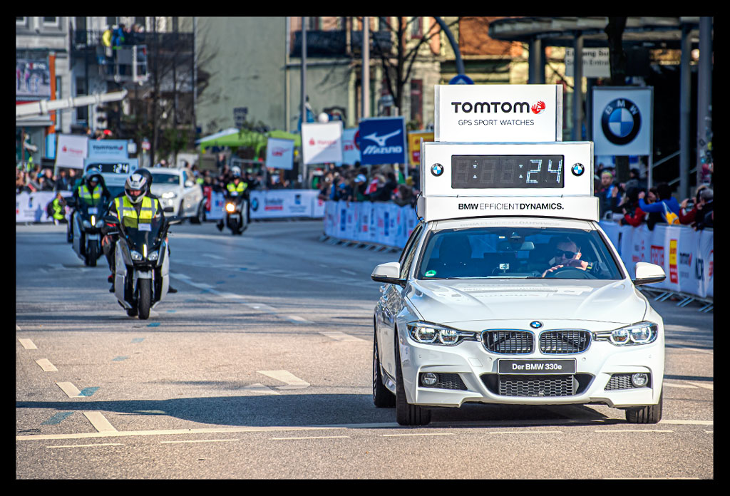 Punkt 9 erfolgte bei strahlendem Sonnenschein der Startschuss. Es wurde applaudiert und ich war in absoluter Marathonstimmung und hin und weg von dem Safety Car, das ich bereits am Vortag schon bewundert habe. Wenige Minuten nach dem Start ging es auch für mich über die Startlinie. Bereits nach einigen Metern war mein Puls so hoch, wie ich es eigentlich eher vom Lauf als Abschluss eines Triathlons kenne oder von Läufen, die ich von Anfang bis Ende mit einer deutlich höhere Geschwindigkeit laufen würde. Sprich, ich hatte einen Puls, den ich sonst nur bei einem Tempo schneller als 4:30 haben dürfte. Also nichts, was ich auf einem Marathon laufen könnte. Ich schob es zunächst auf die Aufregung, wodurch auch gern mal mein Asthma verschlimmert wird, was aber hoffentlich bald vergehen sollte. Also lief ich genau so, wie ich es von meinen langen Trainingsläufen gewohnt war. Ich schlug eine gute 5er Pace ein, die ich auch bis zur Halbmarathonmarke gelaufen bin. Aber schon nach knapp zehn Kilometern wusste ich, dass ich deutlich über meinem Leistungsvermögen lief. Nicht von der Geschwindigkeit her und schon gar nicht vom Kopf her, sondern vom Puls. Alles widersprach sich. Ich fühlte mich krank. Es fühlte sich an, als wäre ein Tunnel um mich herum. Ich konzentrierte mich auf jeden einzelnen Schritt. Ich sprach noch kurz mit Mathias, den ich schon Jahre von den Brooks Ambassadors her kenne und ab und zu bei Marathons treffe. Aber selbst das verschwamm.