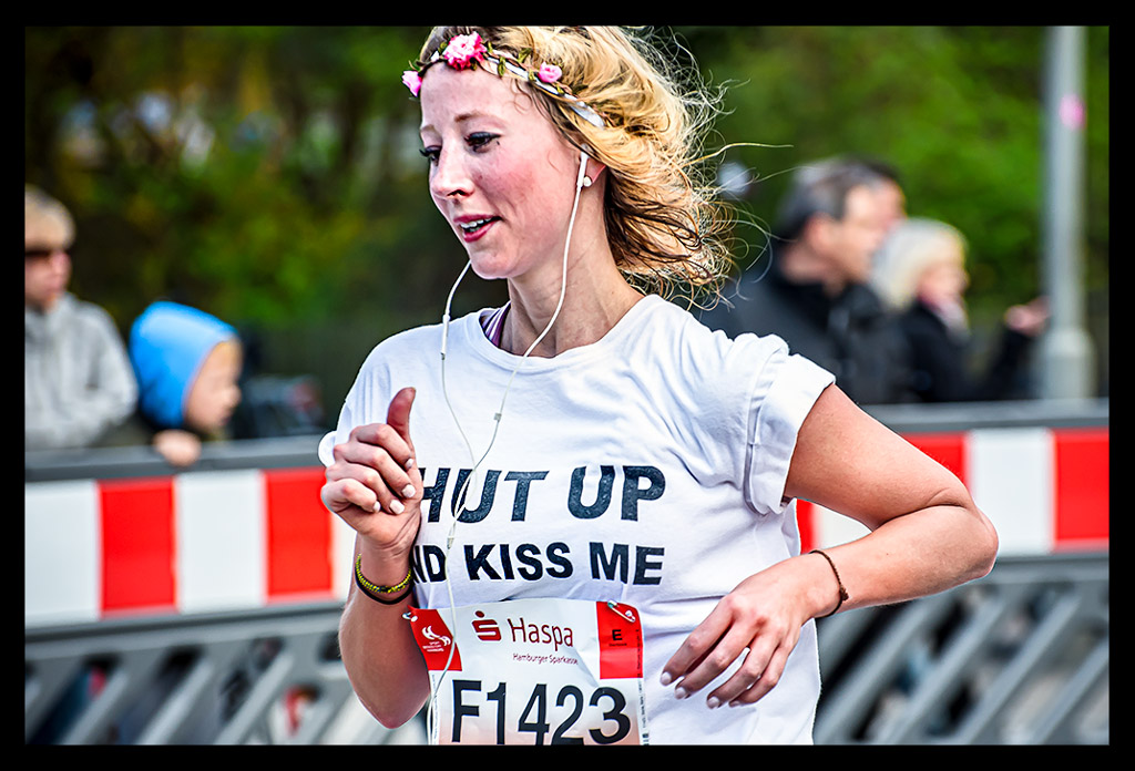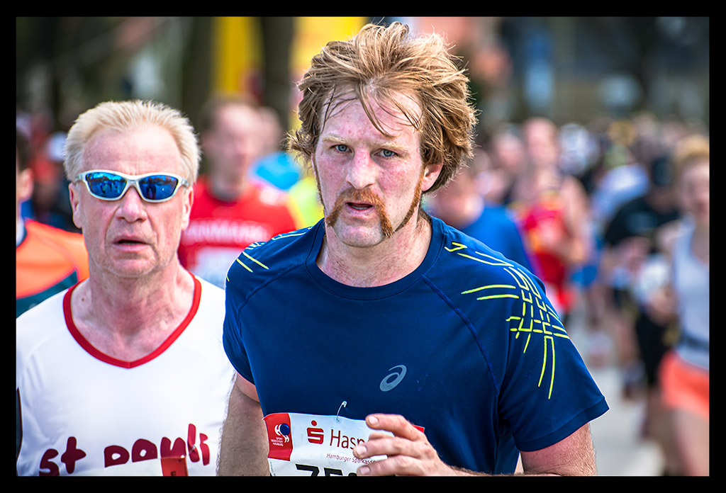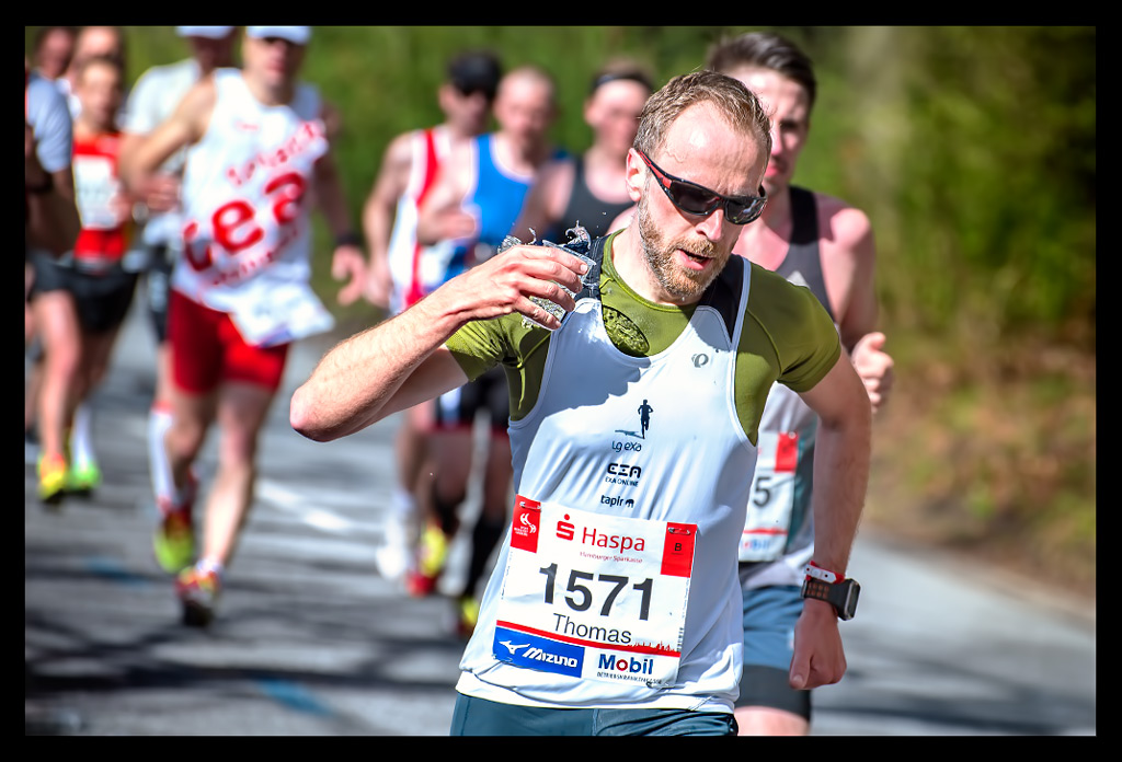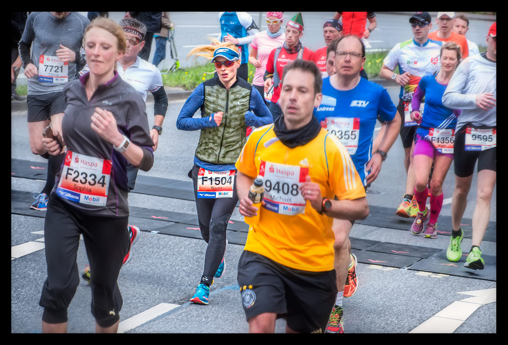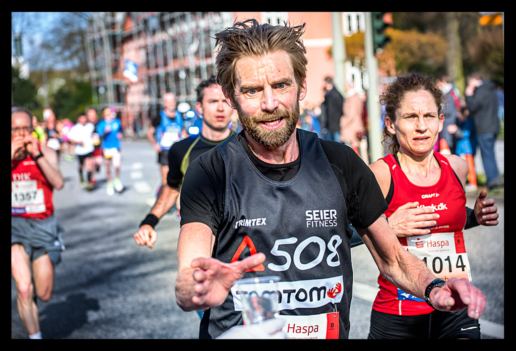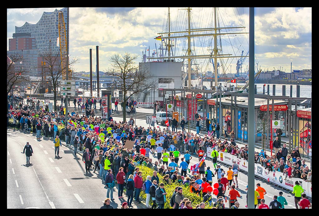 Ich schoss auf die Elbchaussee und wollte einfach nur weiter laufen. Aber die Zuschauer überraschten mich regelrecht. Ich versuchte den heiß ersehnten Spaß zu haben. Machte hier und da von der unglaublichen Stimmung einige Bilder. Ich genoss den Hafen und die Sonne so sehr, dass ich mich bis Kilometer zwölf hangeln und erfolgreich verdrängen konnte, dass meine Muskeln bereits übersäuerten. Dennoch wohl wissend, dass ich gegen eine Wand laufen würde! –und die würde steinhart sein. Zu wenig Sauerstoff und ein Puls wie bei einem 10km Wettkampf forderten Tribut. Mein Brustkorb fühlte sich von den tiefen Atemzügen an, als hätte ich nie vorher Sport gemacht. Ich wollte einfach bis zur Halbmarathon-Marke durchziehen. Von da an stand einfach nur noch ein weiterer HM auf Plan. So als wäre ich bei einer Mittelinstanz gerade vom Rad gestiegen. Dass ich das auch total erschöpft über die Bühne bringen konnte, wusste ich. Mein Kopf lief stur weiter und zog meinen Körper hinterher. Ich weiß, dass ich zu Hause ein Training nach wenigen Minuten abgebrochen hätte. An diesem Tag sollte aber die Unvernunft siegen. Ja, mir ist klar, dass all das nicht zum Nachmachen empfohlen ist und sicher mehr als unvernünftig war.