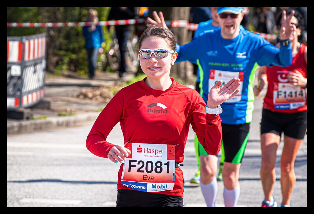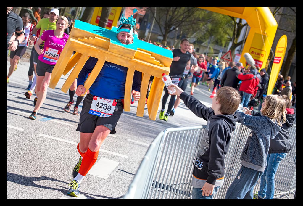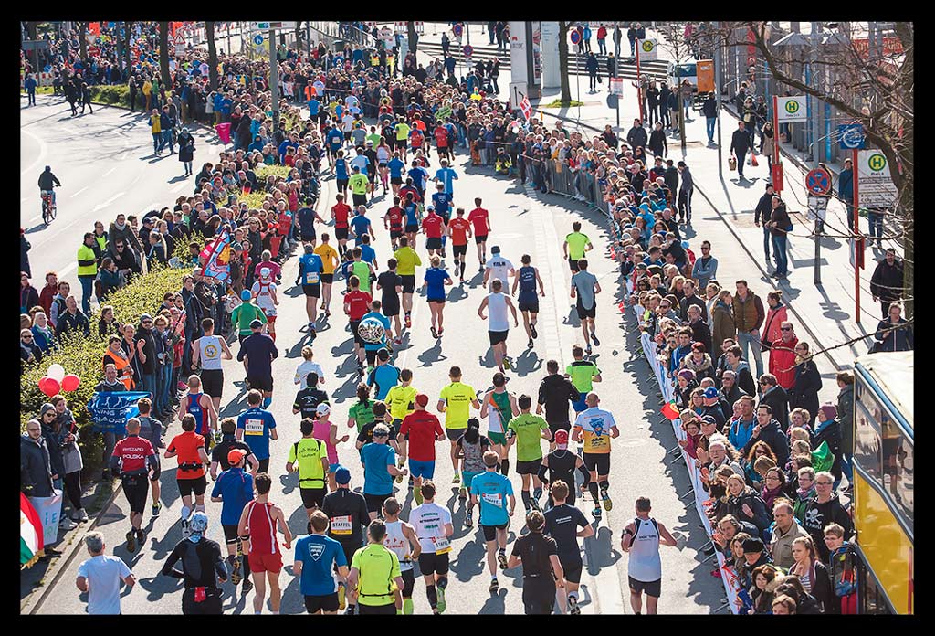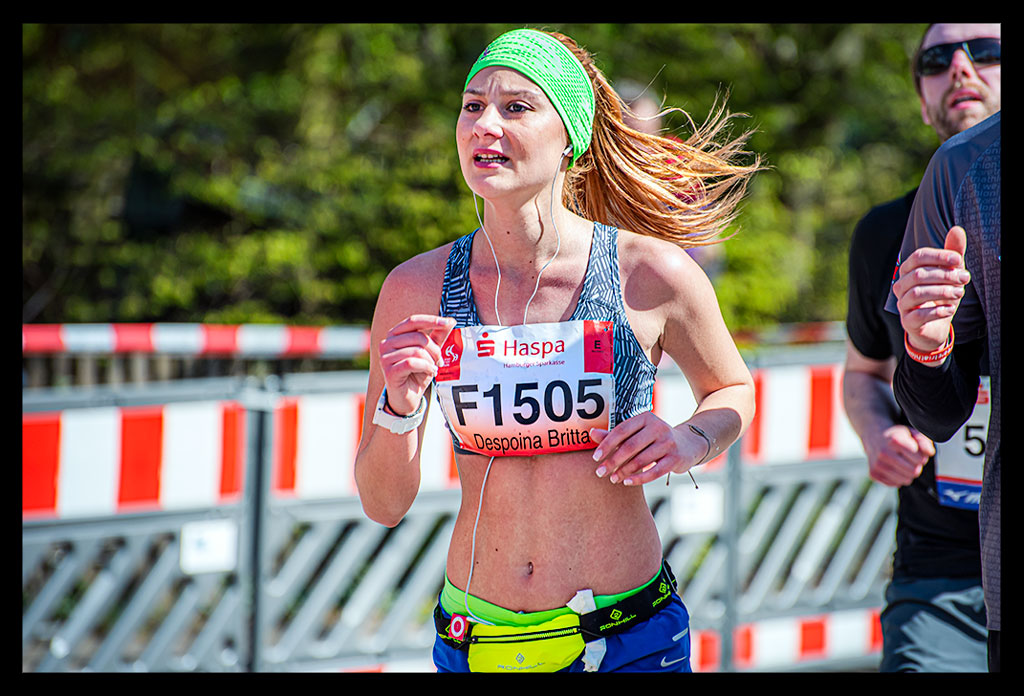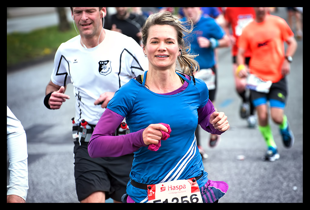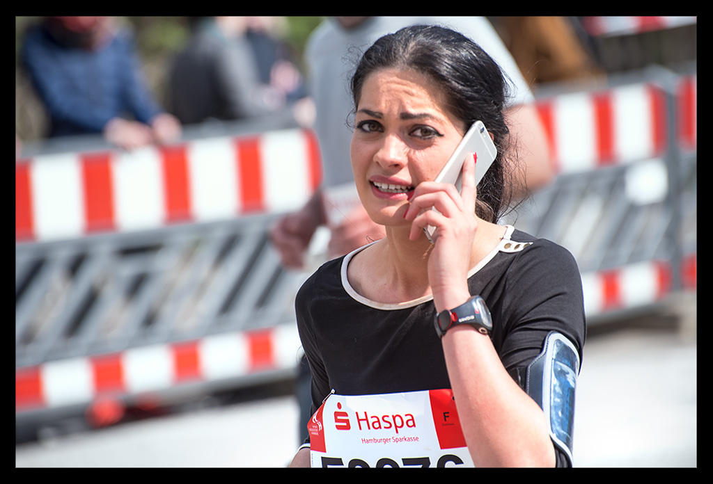 Ich schoss auf die Elbchaussee und wollte einfach nur weiter laufen. Aber die Zuschauer überraschten mich regelrecht. Ich versuchte den heiß ersehnten Spaß zu haben. Machte hier und da von der unglaublichen Stimmung einige Bilder. Ich genoss den Hafen und die Sonne so sehr, dass ich mich bis Kilometer zwölf hangeln und erfolgreich verdrängen konnte, dass meine Muskeln bereits übersäuerten. Dennoch wohl wissend, dass ich gegen eine Wand laufen würde! –und die würde steinhart sein. Zu wenig Sauerstoff und ein Puls wie bei einem 10km Wettkampf forderten Tribut. Mein Brustkorb fühlte sich von den tiefen Atemzügen an, als hätte ich nie vorher Sport gemacht. Ich wollte einfach bis zur Halbmarathon-Marke durchziehen. Von da an stand einfach nur noch ein weiterer HM auf Plan. So als wäre ich bei einer Mittelinstanz gerade vom Rad gestiegen. Dass ich das auch total erschöpft über die Bühne bringen konnte, wusste ich. Mein Kopf lief stur weiter und zog meinen Körper hinterher. Ich weiß, dass ich zu Hause ein Training nach wenigen Minuten abgebrochen hätte. An diesem Tag sollte aber die Unvernunft siegen. Ja, mir ist klar, dass all das nicht zum Nachmachen empfohlen ist und sicher mehr als unvernünftig war.
