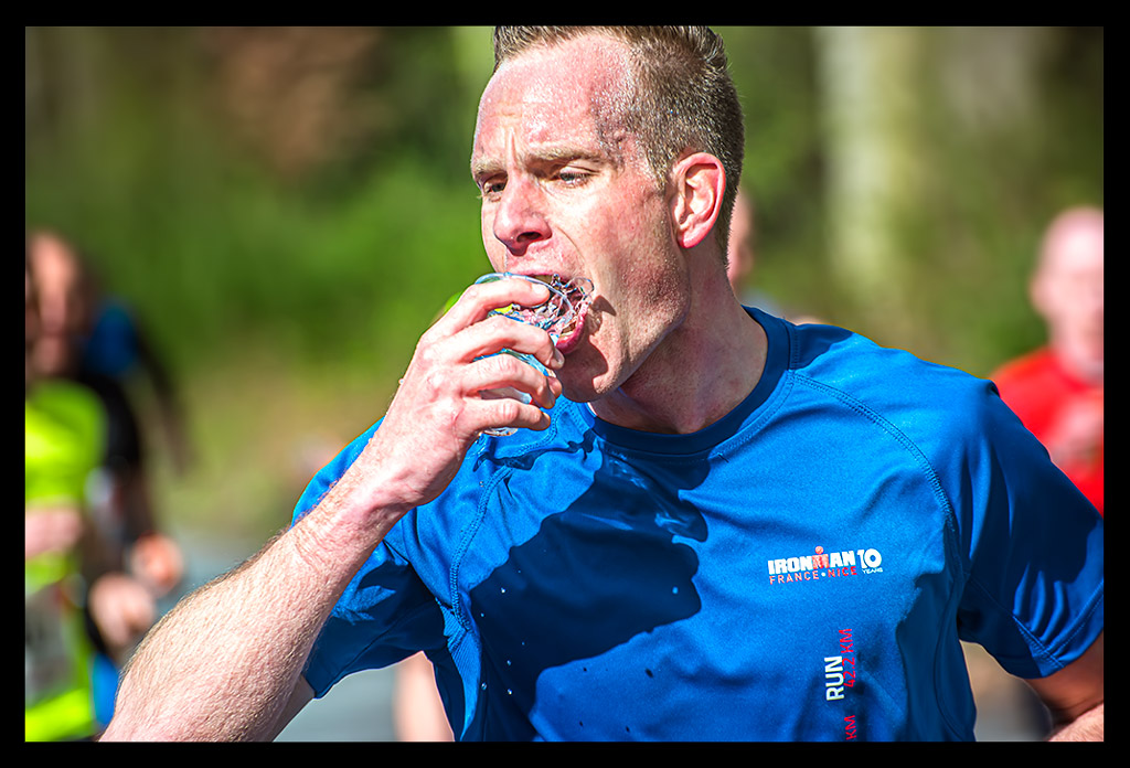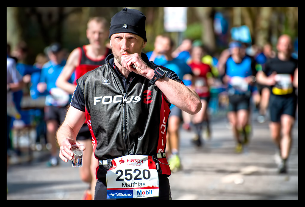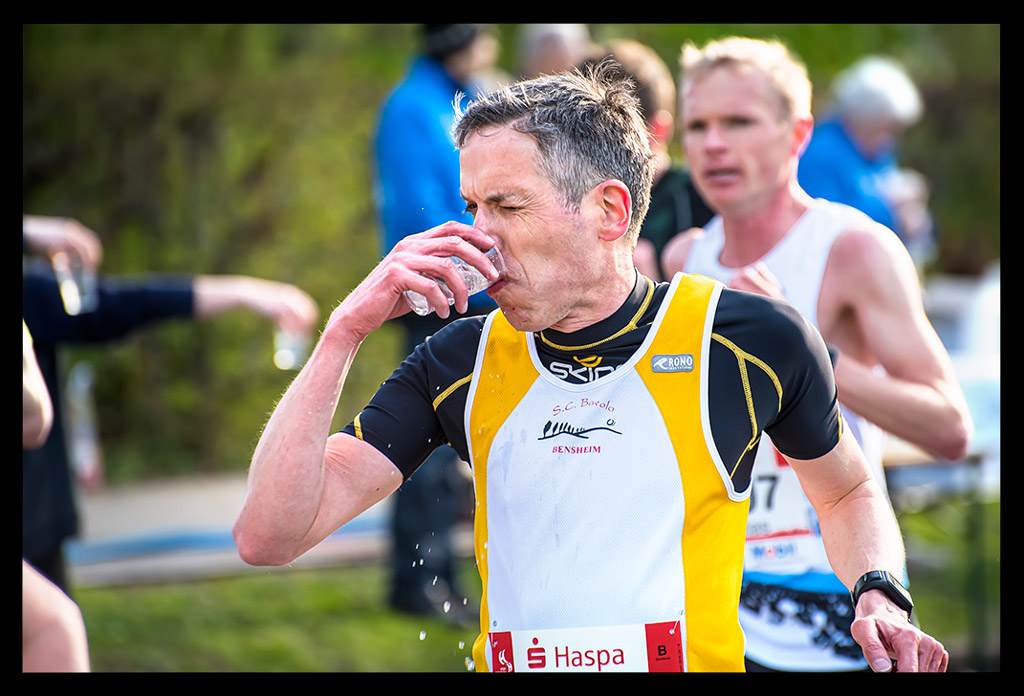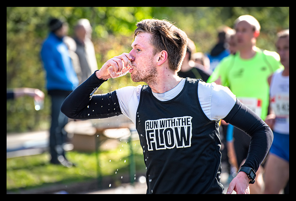 Dennoch ließ ich es mir nicht nehmen, mich exakt an meine Verpflegungsstrategie zu halten. Der Bauch sollte geschont werden, also nahm ich an jeder einzelnen Wasserstation einen Schluck, den ich im Mund gut vorwärmte. Das half auch etwas, dass die Kälte der Getränke meine Bronchien nicht noch mehr belasteten. Nach sieben Kilometern folgte das erste Gel, obwohl mir der Sinn wirklich nicht nach irgendetwas stand. So ging es alle sieben Kilometer weiter. Ich quälte mir die Gele herunter und nahm immer wieder Wasser dazu. Die Süße war kaum zu ertragen. In Kombination mit Asthma kratzt sie einfach nur schrecklich in mir drin. Aber letztlich hielt mich das klebrige Zeug am Laufen. Bis zum Ende hin! Auch hier noch einmal der Tipp an alle Organisatoren von Sportveranstaltungen: Plastikbecher gehen wirklich gar nicht! Ich hörte auch bei diesem Lauf wieder, wie schwierig es sich daraus trinken lässt. Pappbecher sind nicht nur umweltfreundlicher, sondern lassen sich auch leichter zusammendrücken und daraus trinken!