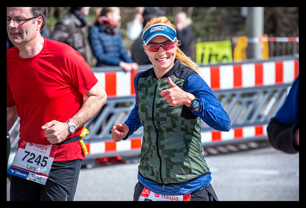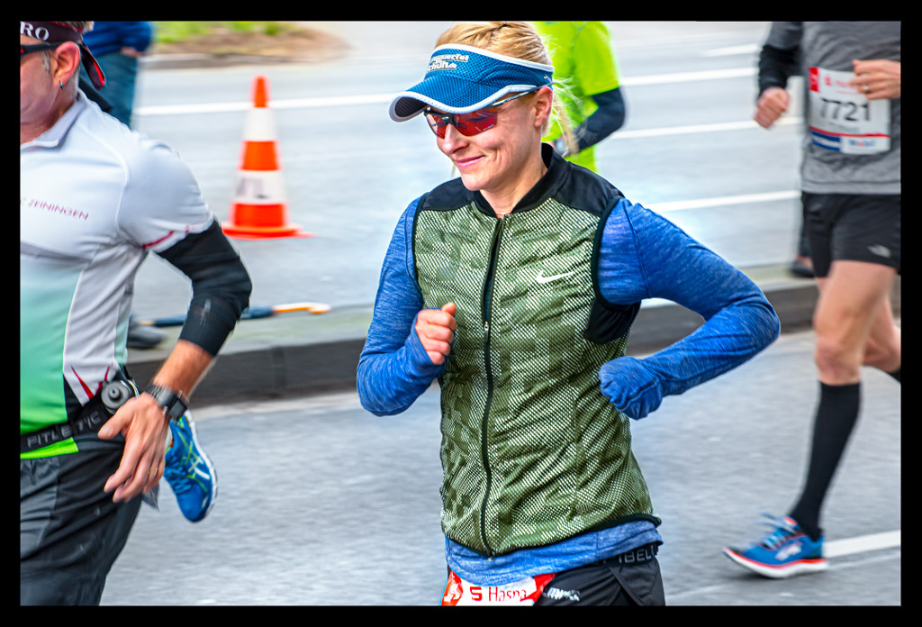 Ein Trost blieb mir: der Mann mit dem Hammer konnte mich an diesem Tag nicht eiskalt erwischen. Der war nämlich bereits ganz am Anfang mit in den Lauf fröhlich tänzelnd eingestiegen. Von nun an sollte meine Geschwindigkeit dramatisch abnehmen. Ich musste dringend etwas für meine Herzfrequenz tun. Ansonsten würde es mir noch herausspringen. Ich behielt sie peinlich genau im Blick. Meine Familie wartete bei Kilometer 33 auf mich. Es war ein hartes Stück Arbeit, bei dem ich einfach nur einen Schritt nach dem nächsten machte. Ein zähes Unterfangen bei so einer Distanz. Ich war unglaublich froh, als ich es bis dahin geschafft hatte. Ein Lächeln ist bei dem Stress für den Fotografen Olli natürlich immer drin und selbstverständlich auch für alle, die mich sonst am Streckenrand angefeuert haben.