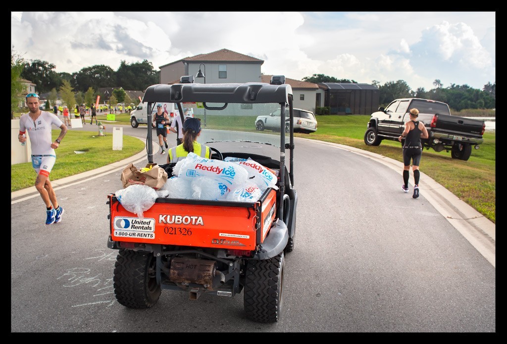 Nicht immer ein Spaß, aber wenigstens sorgt das bei mir für den Blick auf das Wesentliche. Die erste Runde war nur auszuhalten, weil ich meinen Forerunner stur im Blick hatte und genau wusste, wie weit ich bereits war. Dank der Kurven und dem Hin und Her, gab es keine Fernsicht. Ich konnte mir nur vornehmen, bis zur nächsten Kurve zu laufen oder bis zum nächsten Zuschauer in den kleinen Wohnsiedlungen. Ich griff noch nie so früh und viel zu anderer Verpflegung als die, die ich selbst mithatte. Also gab es Brezeln, Cliff Blocks, Eiswasser, Eis. Jeder Gartenschlauch, jeder Sprenger, alles nutzte ich von A bis Z. Dennoch wollte ich mich in jeden Alligatortümpel schmeißen, den wir passierten. Das Eis in meinen Strümpfen und im Tri Suit schmolz so schnell, dass es mir bis zur nächsten Verpflegungsstation vorkam, als würde ich eine Wüste durchqueren. Die Zeit verflog. Die Strecke blieb.