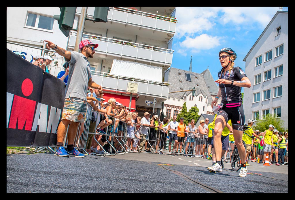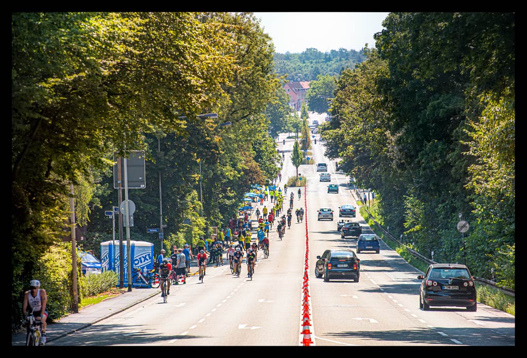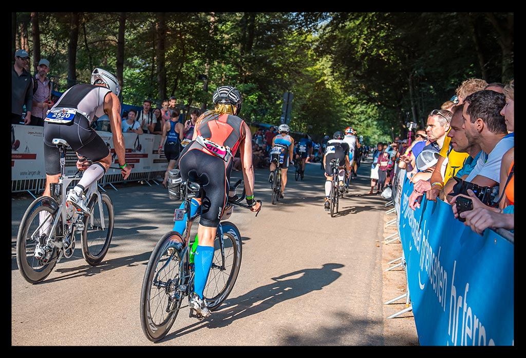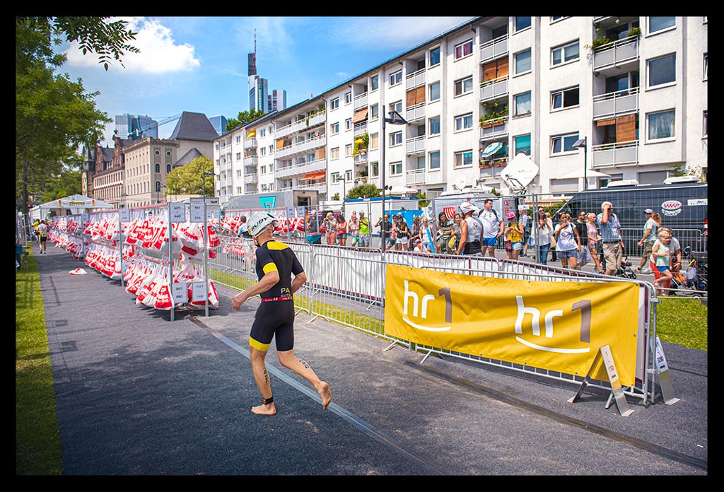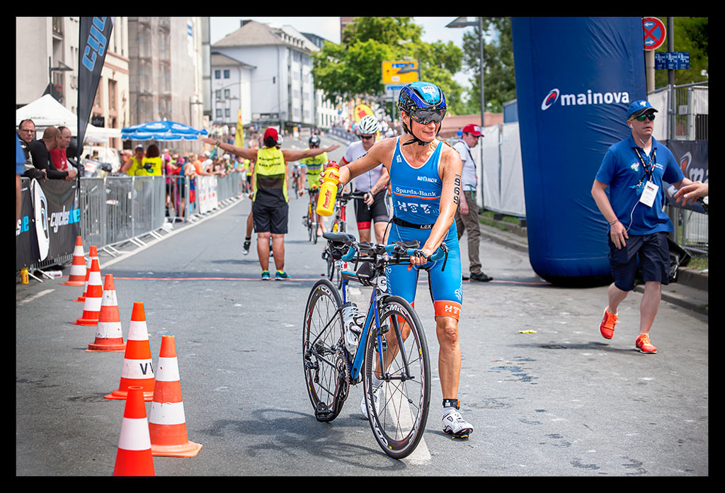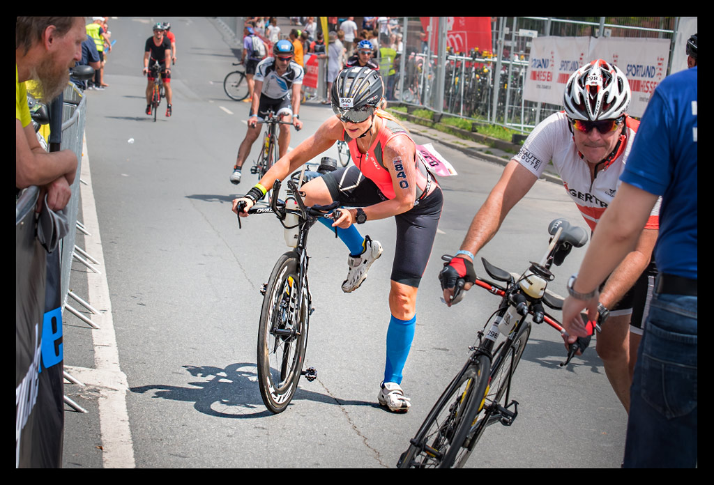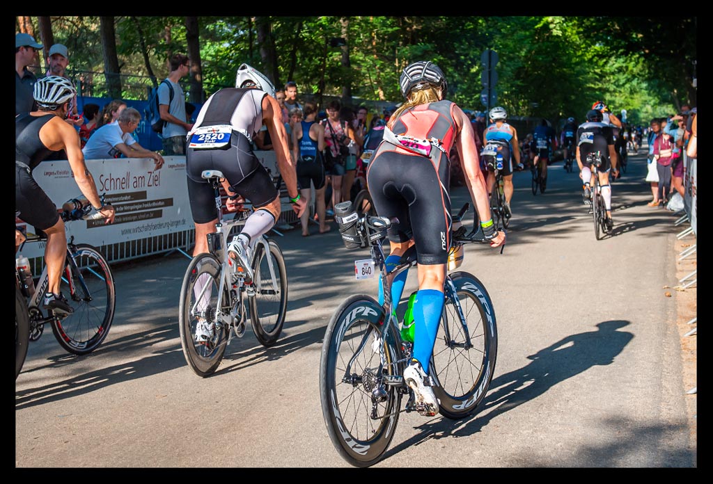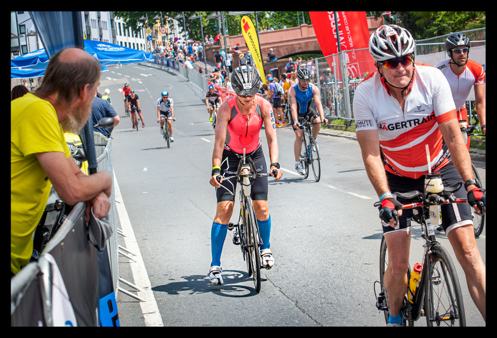 Das Aufsteigen gestaltete sich wieder mehr als lästig. Eine leichte Kurve hinter dem Ausgang des Wechselbereichs sorgte für einen Stau. Manche Athleten blieben mitten im Weg stehen. Einige davon quer. Die nächsten schoben ihr Rad von links nach rechts und von hinten schrien andere, dass sie links vorbei wollten. Warum auch keiner darauf kommt einfach mal zehn Meter weiter um die Ecke an den rechten Rand zu flitzen und da in Ruhe aufzusteigen?! Also musste ich dran glauben. Erst einmal weitergehen, sich aus der Schusslinie bringen, dann aufsteigen und endlich den zweiten Teil des Ironman Frankfurt in Angriff nehmen.
