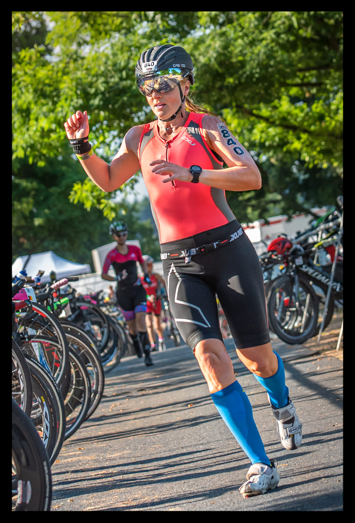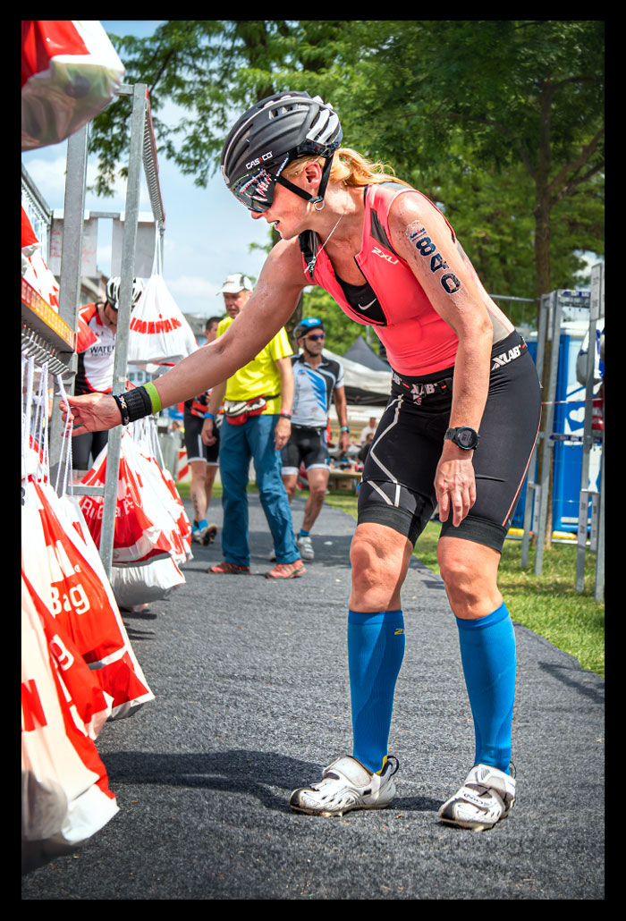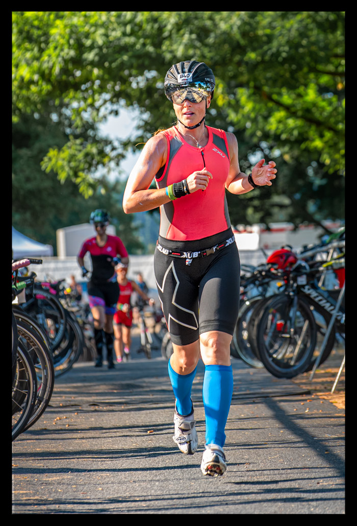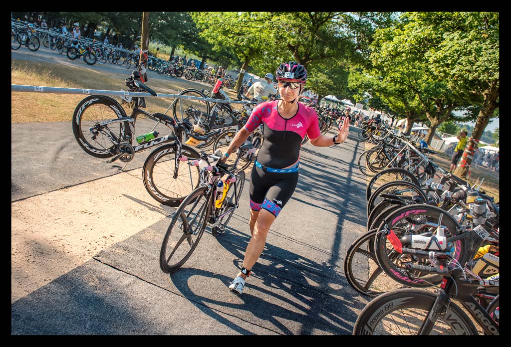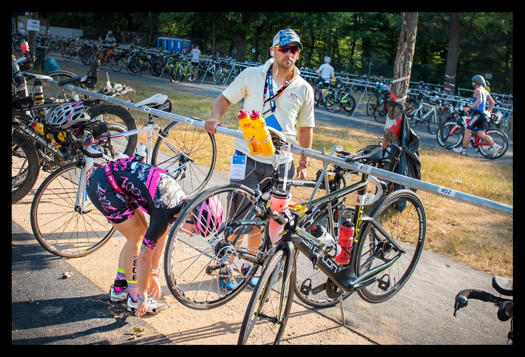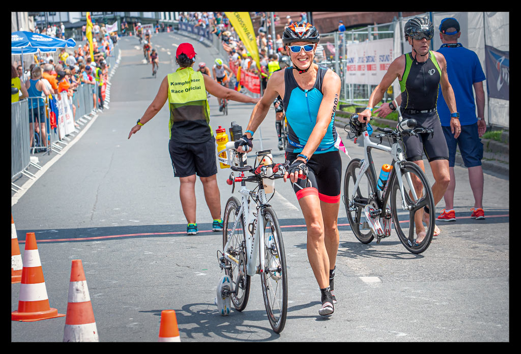 Die ersten Schritte nach dieser Tour. Was für ein Gefühl. Immer wieder interessant. Deshalb also dieses ganze Koppeltraining!? Ein Helfer nahm mir mein Fuji ab. Es gab einen Stau von Rädern und ich war etwas in Sorge, dass mein Liebling leiden müsste. Helfer rannten mit Rädern hin und her. Aber für mehr Sorge blieb keine Zeit. Ich flitzte wackelig den unebenen Weg quer durch die Wechselzone, erreichte genau richtig meinen Gang, in dem mein zweiter Wechselbeutel hing. Ok, kurz vorher musste ich noch eine kleine Dixiepause einlegen nicht ahnend, dass es Programm beim Laufen werden würde. Wie der Marathon lief und endete, erfahrt ihr im finalen dritten Teil, auf den ich mich besonders freue. So sehr, wie ich mich nach der Radrunde trotz der Hitze auf meine Laufschuhe freute. Laufen eben!