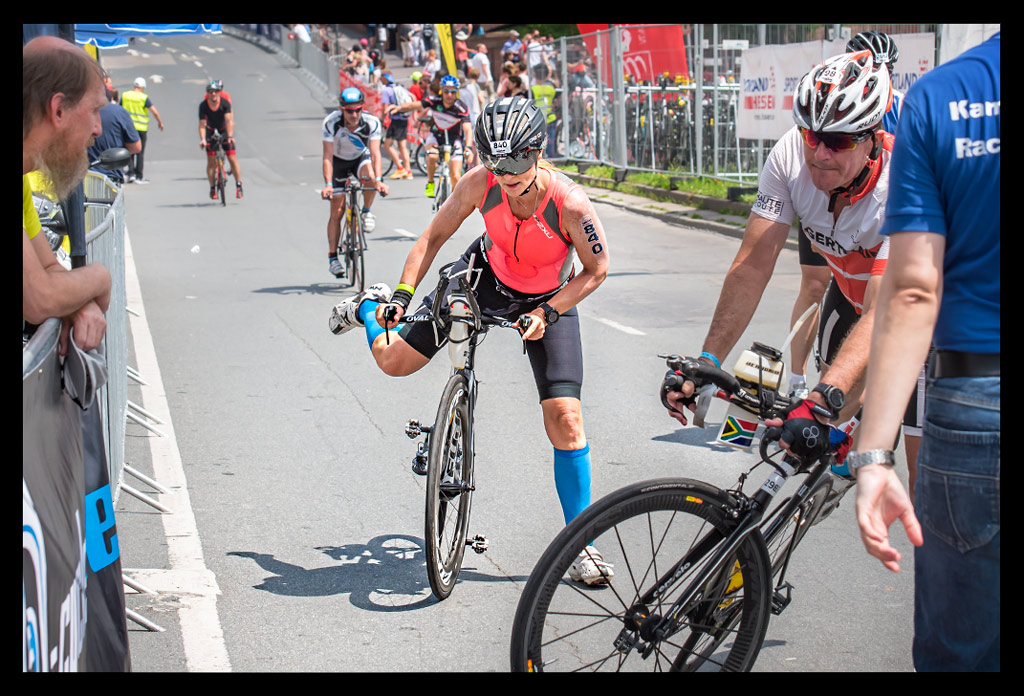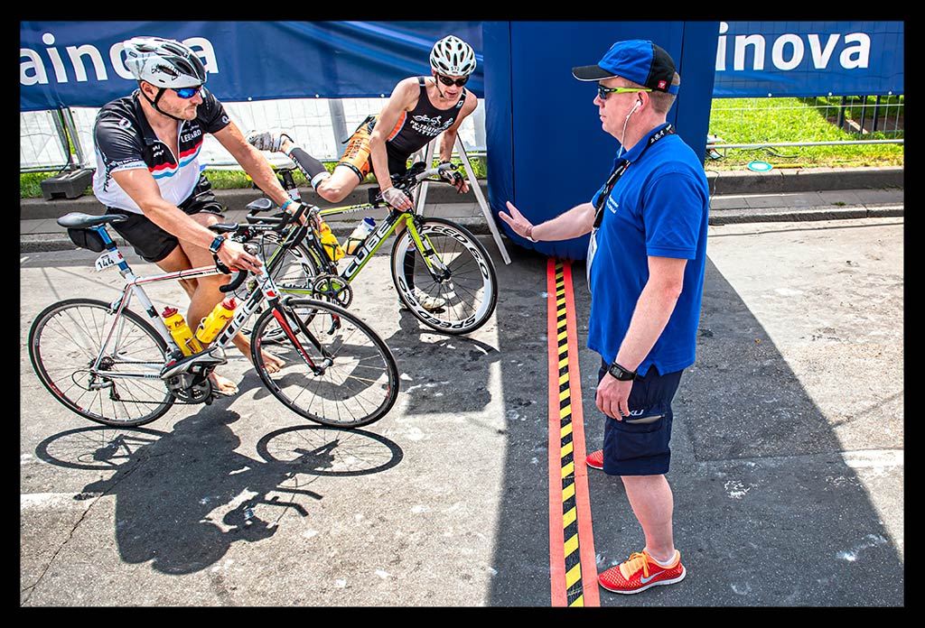 Mit ordentlichem Schwung ging es auch um die letzte Kurve. Dann ein paar Meter abwärts und plötzlich stand ich bremsend vor den Kampfrichtern kurz vor dem Zielbogen der Radstrecke mit der schwarz, gelb, orangenen Ziellinie, die man um Himmelswillen nicht überfahren sollte! Die Kampfrichter stand da wie Darth Vader und versuchten alles, um die Athleten machtvoll am Überfahren zu hindern.