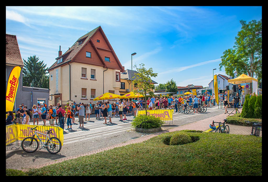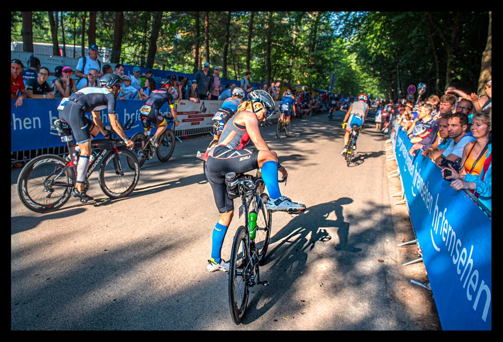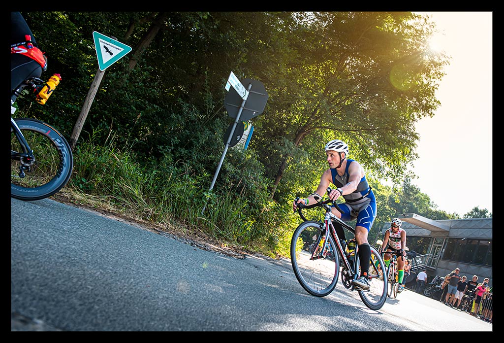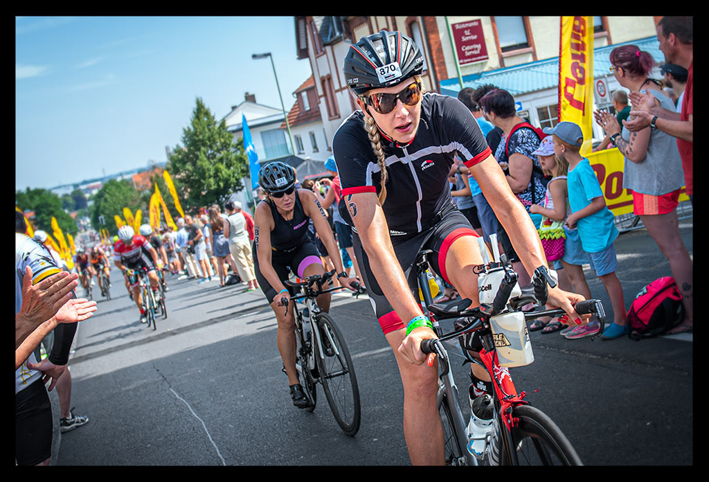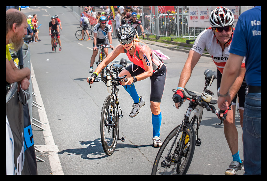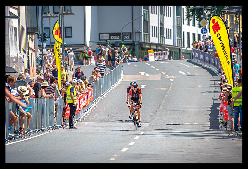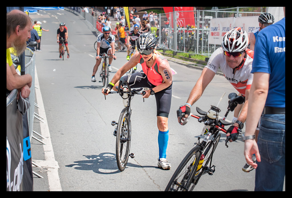 Von den schönen Fachwerkhäusern und dem Tor, das wir am Gipfel der Anhöhe durchfuhren, bekam ich erst auf Runde zwei wirklich etwas mit. Klasse fand ich, dass diese kurze Passage komplett mit Absperrgittern gesichert war. In Runde 1 war es super leer, als ich aufschlug. Aber auf der zweiten war der Abschnitt mit Athleten übersät. Da hätten Zuschauer, die sich verirrt haben, noch gefehlt. Von den Teufeln gab es zum Glück keine Spur. Hinter dem Tor ging es direkt holpernd abwärts. Die großen Pflastersteine wurden zu kleinen bevor wir mit einer scharfen Linkskurve wieder auf glattem Asphalt landeten. Wer dort Werkzeug verlor (was man nicht alles sieht!) oder einen Defekt zu verzeichnen hatte, konnte direkt in die Bremsen gehen. Eine Bike Station war dort ziemlich gut positioniert worden. Ich hatte aber auch unterwegs zum ersten Mal bei einem Triathlon gleich mehrmals Techniker mit Kleinbussen gesehen.
