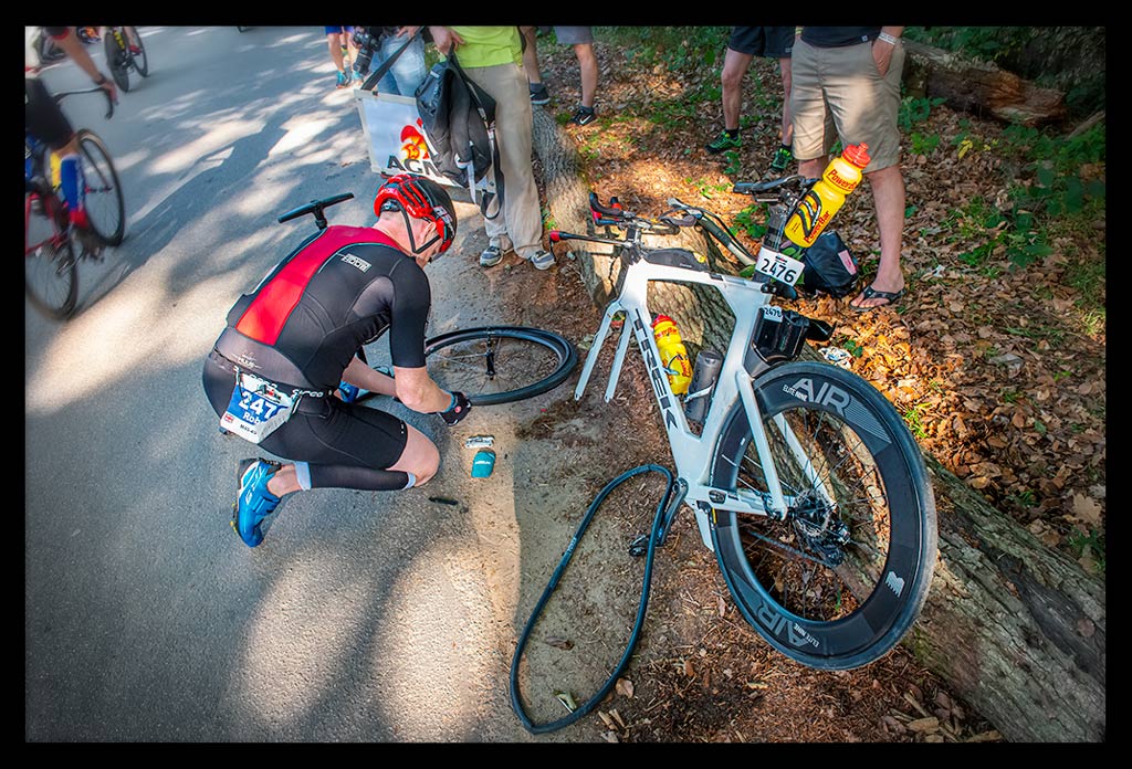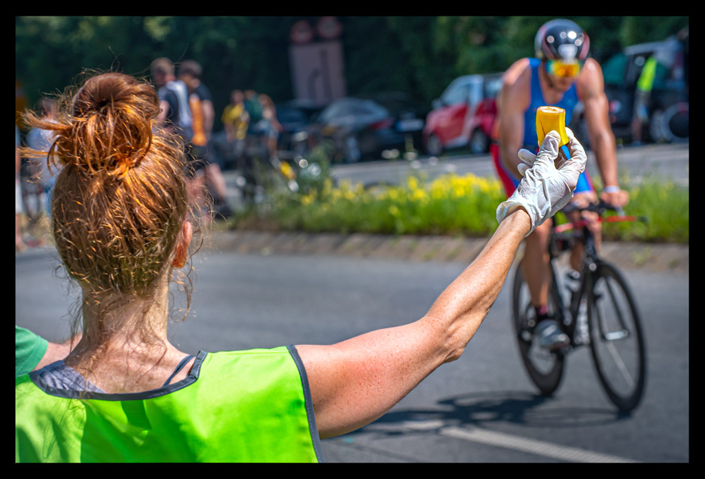 So oft wie ich diese sah, tauchten hier und da die Penalty Boxen auf, die jede für sich reichlich gefüllt war. Manche sogar so voll, dass die Athleten ihre Räder der Reihe nach ins Gras legen mussten. Ich hatte aber auf der Strecke nur sehr nachsichtige Kampfrichter gesehen. Die für meine Eindrücke zwar für Ordnung sorgten, aber nicht wie wild mit Karten und Strafen umher wedelten. Sie wiesen die Athleten eigentlich zunächst einmal kurz zurecht. Ich war zwar nie wirklich allein auf der Strecke. Aber es war auch nicht so voll, dass man nicht genug Platz hatte, um nicht in Gruppen zu enden. Bis auf die oben bereits erwähnten Anstiege.