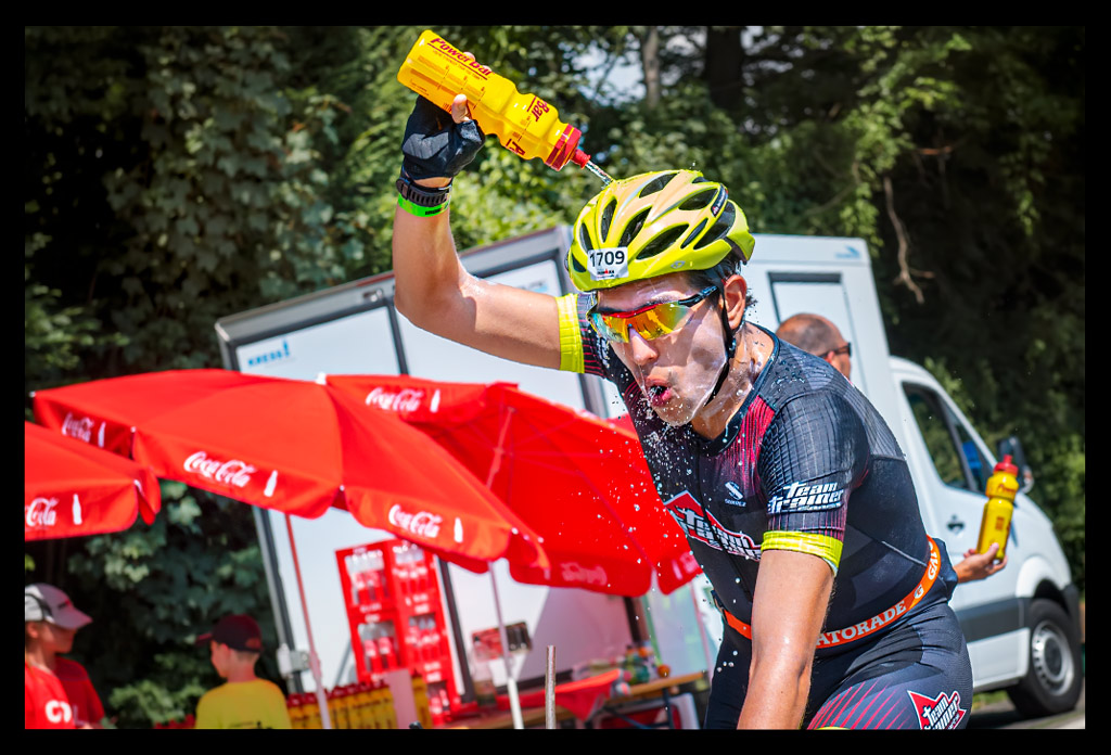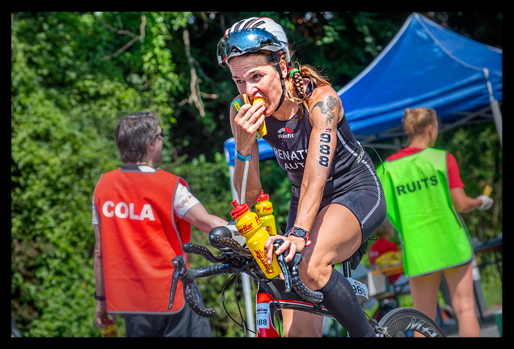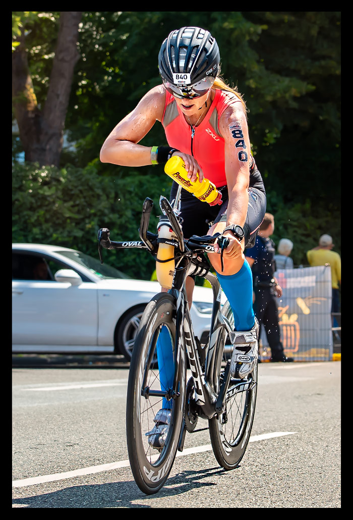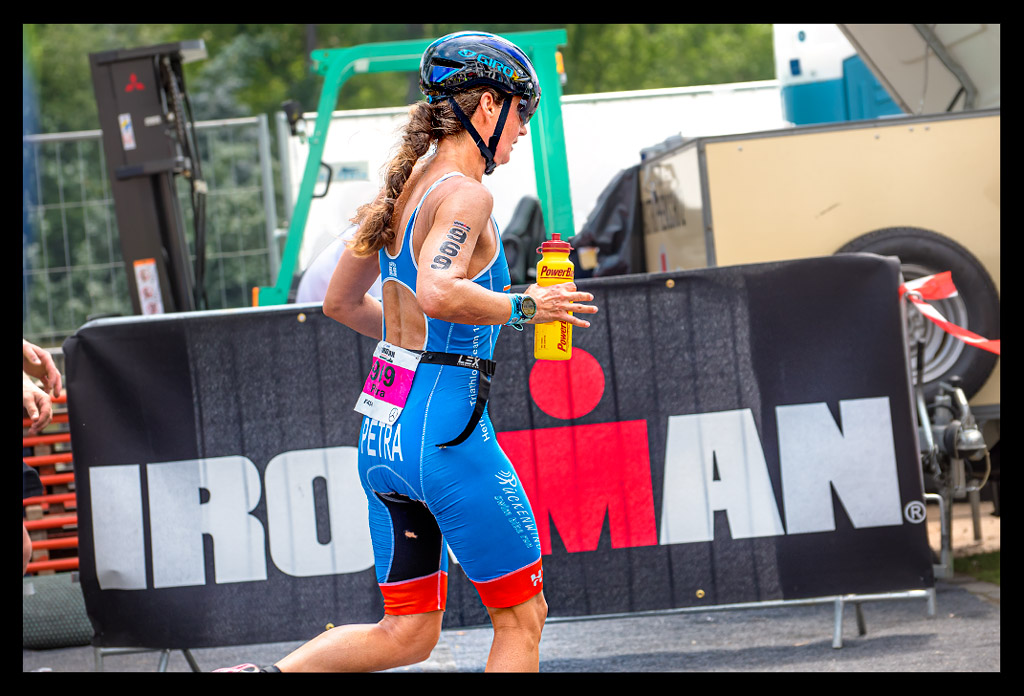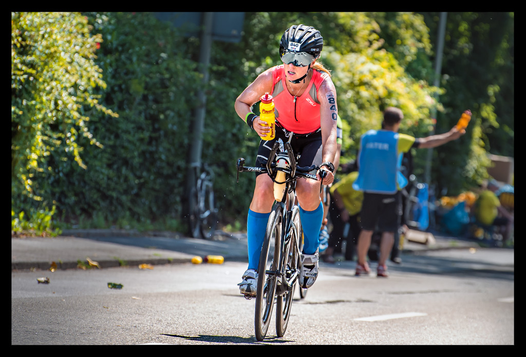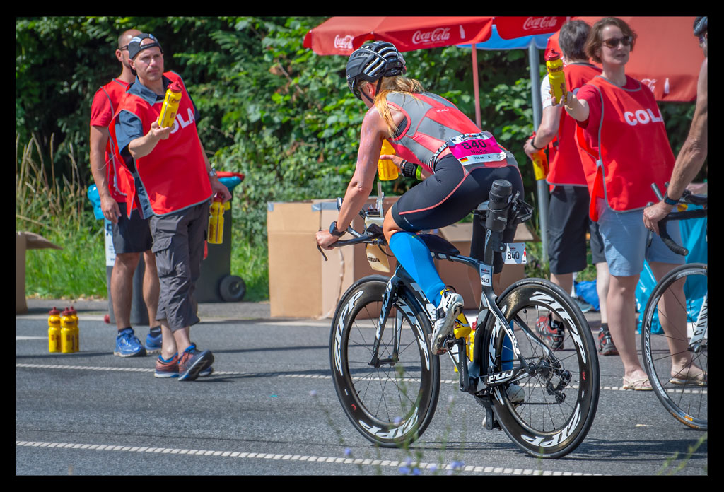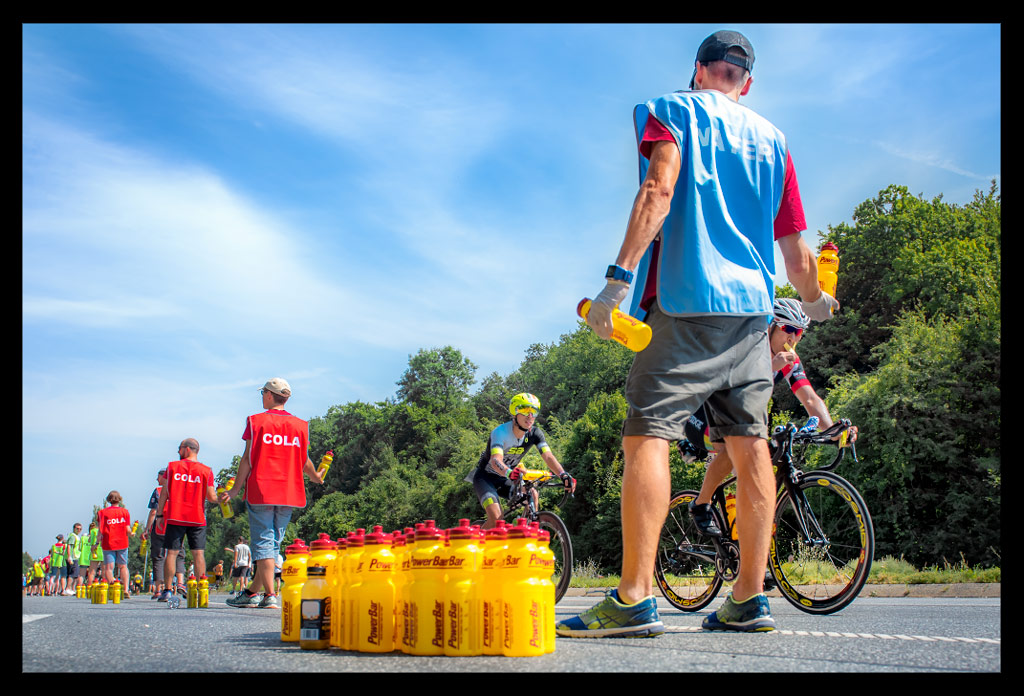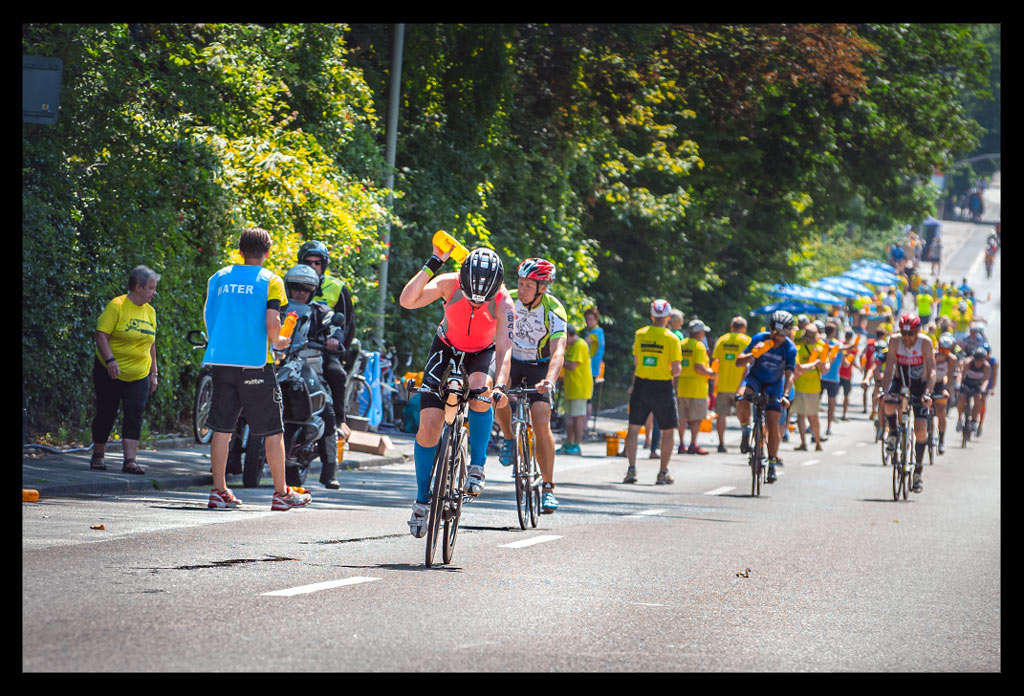 Die Wärme war herrlich. Aber ich wünschte, mir hätte die Luft nicht so zugesetzt. Was sich am See am Morgen noch so wunderbar frisch und klar anfühlte, wandelte sich in seltsame Schwüle. Ich dachte, es wäre nur eine Frage der Zeit, bis die vorhergesagten Wolken aufziehen. Aber ich sollte enttäuscht werden. Die Sonne brannte den ganzen Tag. Zum Glück beherzigte ich den Tipp des MyGoal Training Teams und versuchte von Anfang an meinen Körper herunter zu kühlen. Auf dem Rad hieß das, dass ich KEINE Wasserstation ausließ. Der Rest des Tages sollte später beim Laufen auch nicht anders verlaufen. Ich füllte mit der ersten Wasserflasche meine fordere auf, goss den Rest über Kopf und Beine und griff abschließend noch eine Flasche, die ich mitnahm und die mich zwischen den Verpflegungspunkten von innen und außen kühlen sollte. Zum Glück waren diese lang genug gezogen, dass ich das alles gut auf die Reihe bekam. Ich erlebte auch an keiner Station irgendwelche Hektik.