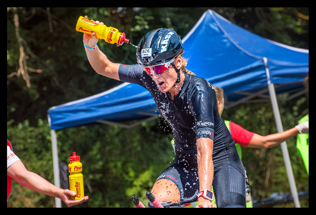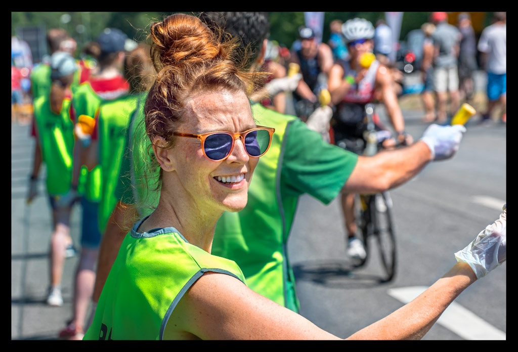 Das einzige Highlight war ein älterer Athlet, der den ganzen Tag immer um mich herum kreiste. Plötzlich kam er wieder von hinten angesaust und grinste beim Strampeln nach oben. Ich muss wohl sehr fragend ausgesehen haben. Er hatte unterwegs seine Kette ölen lassen. Nun liefe es so viel besser! Er trat fröhlich und locker vor sich hin. Das Ganze Gegenteil von mir. Ich konnte Heartbreak Hill kaum mehr abwarten. Ich quälte mich, wie es nur irgendwie ging. Aber nichts an und in mir hatte Lust. Ich habe vermutlich noch nie so entschlossen nach einer Banane gegriffen, wie nach dem Überwinden dieses Berges. Dazu gab es noch einmal eine Ladung kaltes Wasser.