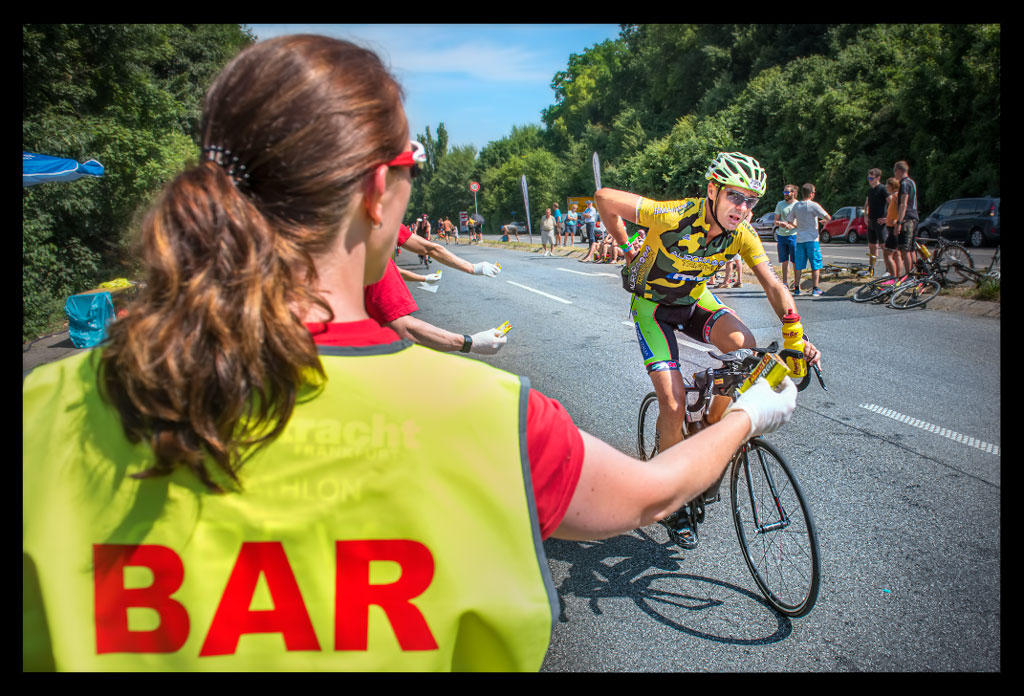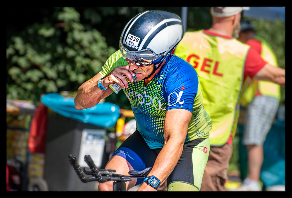 Die auch bei diesem Wetter draußen Stunde um Stunde mit Gartenschlauch standen. Mein Fuji mochte das nicht so. Ich aber um so mehr! In der zweiten Runde machte sich langsam eine richtig fiese Müdigkeit breit. Ich hatte eine ziemlich durchgetaktete Ernährungsstrategie, an die ich mich auch hielt. Das funktionierte alles prima. Leider vermisste ich unfassbar meine Kaffeepause bei meiner Familie auf halber Strecke. Was hätte ich für einen Espresso oder einen Mittagsschlaf gegeben. Ich hatte zwei rare Koffeingele. Eins davon war für wenige Kilometer vor dem Wechsel reserviert, damit ich meinen Kreislauf in Schwung hielt, wenn ich aus dem Sattel sprang. Das zweite musste dringend nach 100km kurz nach Beginn der zweiten Runde dran glauben. Ich hätte sonst eine Pause einlegen müssen. So wie der Athlet, der sich in den Graben unter einen Baum setzte. Der Kampfrichter, der gerade an mir vorbei schlich war genauso irritiert wie ich. Er kreuzte meinen Weg, hielt kurz an. Aber dem Athleten fehlte nichts. Er schien wirklich nur eine Pause zu machen. Ich zögerte kurz, aber nein. Es musste weiter gehen. Es musste! Eine Verpflegungsstation kam mir wieder zu Hilfe. So hangelt man sich dahin. Also ich. Den ganzen Tag.