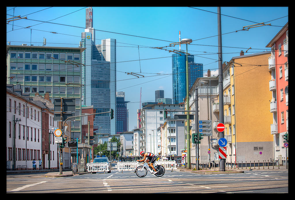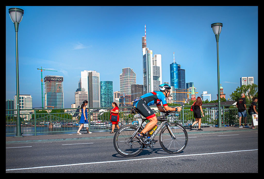 Mein Feuer brannte endlich wieder und die Zuckelei war zu Ende! Vermutlich weniger wegen der Banane als vielmehr Dank der Aussicht auf die Frankfurter Mainhattan Skyline. Die konnte man nämlich kurz vorher schon weit über das Land hinweg sehen. Als ich Frankfurt erreichte, gab es kein Halten mehr. Mein Kopf setzte wieder ein. Ich ärgerte mich maßlos über den schäbigen Rennverlauf, wohlwissend dass ich mit etwas Glück haarscharf unterhalb der 6-Stunden-Marke bleiben könnte.