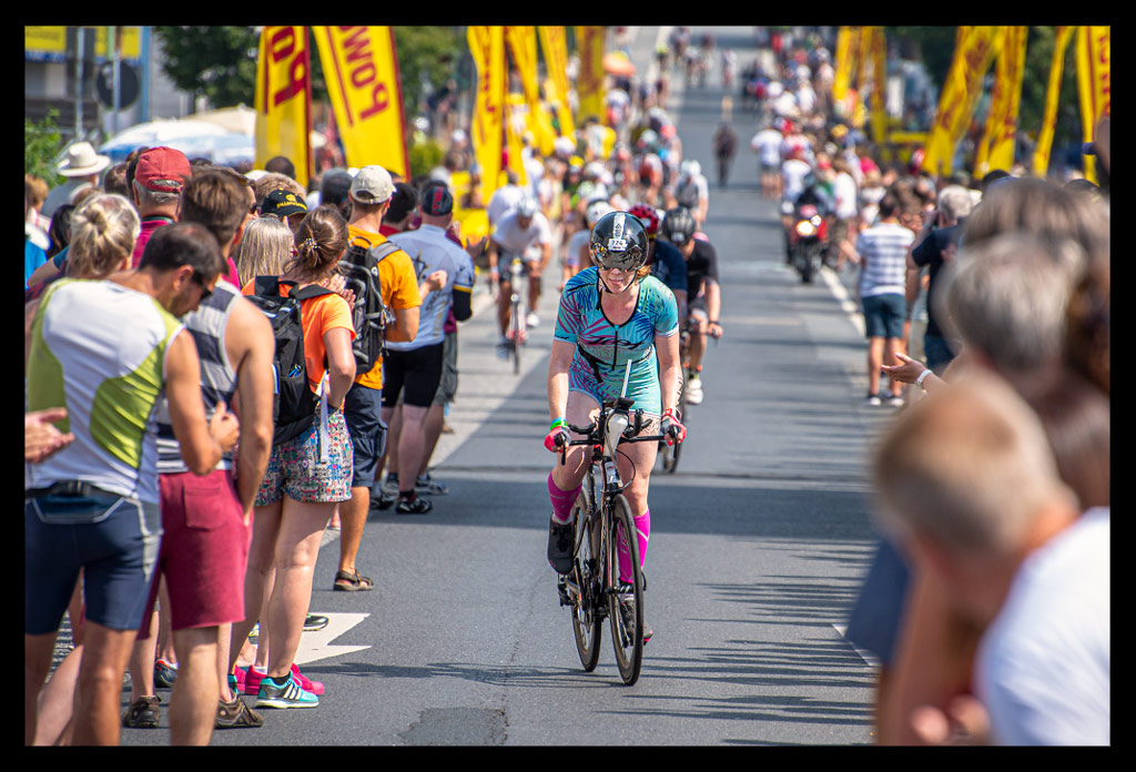 Die kleinen und großen Stimmungsnester hielten mich aber dennoch bei Laune und sorgten für die gewünschte Ablenkung. Es gäbe ja nichts Schlimmeres als Langeweile auf einer knapp sechs Stunden langen Radausfahrt. Kurz hinter Frankfurt kreuzten wir eine Bahnstrecke. Ab da begann so richtig der wellige Teil der Strecke. Vor dem ersten nennenswerten Anstieg – The Beast – gab es schon den ersten Verpflegungspunkt. Die Zuschauer, die kurz danach auftauchten, waren auch in der zweiten Runde noch da, was ich wirklich außerordentlich spitze fand! Es waren hier und da ein paar weniger von ihnen vor Ort, als ich zum letzten Mal an all den Highlights vorbei kam. Aber es war dennoch für ausreichend Motivation gesorgt! Die Athleten häuften sich natürlich auch immer dann, wenn es wieder anstrengender wurde. Da gab es wenig Möglichkeit, nicht im Windschatten von irgendjemandem zu landen. Wen kann man es auch verübeln. Wo sollte man hin? Wir durften die Mittellinie nicht überqueren. Was aber einige Touristen nicht so ganz verinnerlicht hatten. Ich sah oft Athleten, die auf der linken Spur fuhren. Selbst wenn rechts ausreichend Platz war.