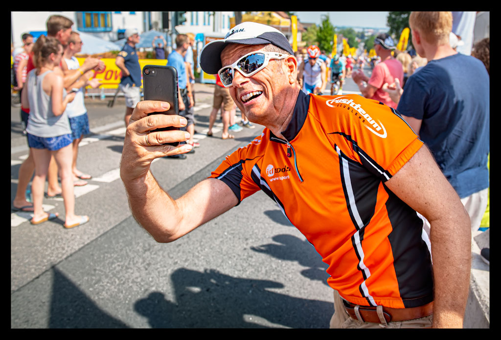 So wie nun auch der Kampfrichter auf dem Motorrad weiter zog, rollte ich dahin. Kurzzeitig doch etwas gelangweilt. Plötzlich häuften sich die Ereignisse. Ich traf auf den Besenwagen, der hinter den letzten Athleten hinterher fuhr. Nach einer Kurve dann eine Sperrung der rechten Spur. Einer der wenigen Unfälle, die ich sah. Zwei Krankenwagen ließen eine schmale Gasse… Irgendwann stand dann jemand mit seiner Sattelstütze am Wegesrand. Da wackelt man doch umgehend selbst noch unruhiger hin und her.