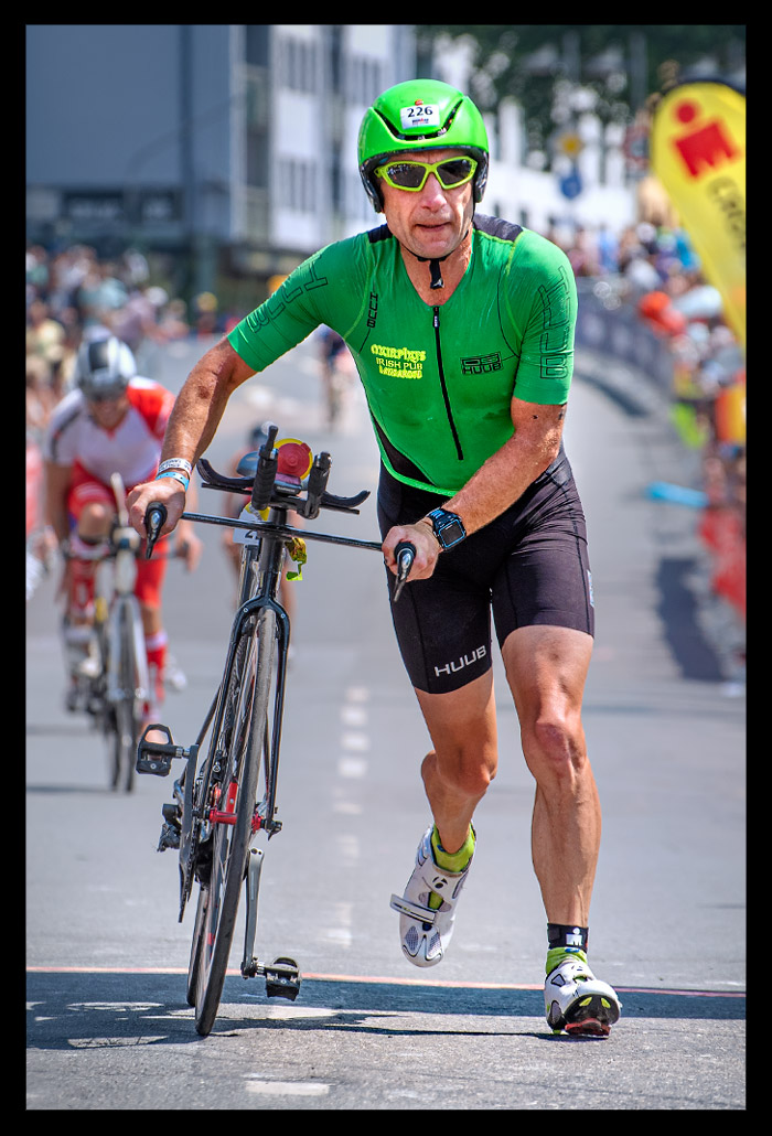Die letzten 5 Kilometer bin ich mit einem knappen 40er Schnitt durch die City gerauscht… Irgendwie ein dummes und fast aussichtsloses Unterfangen, aber es hat sich gelohnt. Klar, natürlich sollte man sich zum Ende etwas locker schütteln und langsam mal den Kreislauf für das Laufen vorbereiten. Das tat ich dieses Mal mit einem koffeinhaltigen Gel und indem ich immer mal wieder aus der Aeroposition heraus kam. Es hat funktioniert und ich würde es immer wieder so machen. Klar, hatte ich vielleicht zwischendrin, so auf den gut 170km davor immer mal wieder gedöst, um nicht zu sagen geschlafen. Aber was soll’s. Für die leidige Zappelei den größten Teil des Radabschnittes wurde ich so wenigstens entschädigt und bin mit 5:59:23 knapp unter den besagten sechs Stunden geblieben. Mit Sicherheit wieder unter dem Potential, was ich mir antrainiert habe und unter dem, was ich mir vorgenommen hatte und unter dem, was möglich gewesen wäre,… wenn da nicht, wenn da nicht… Na ihr habt den Rest ja gelesen. Oder?!