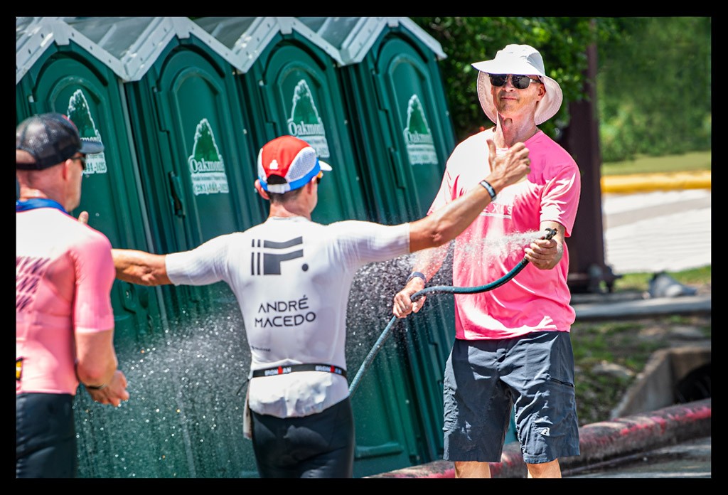 Jede Runde beginnt mit dem Sonnencreme-Tisch am Wechselbereich und einer kleinen Schleife entlang des Kanals. Dem Kanal, in dem wir morgens die letzten Meter der Schwimmstrecke absolviert hatten. Am Nachmittag ging es für uns immer wieder daran vorbei – erst 400 Meter in die eine Richtung, dann 200 Meter zurück, um querfeldein über eine Rampe hinauf zur eigentlichen Laufstrecke zu gelangen. Dort oben wartete ein Helfer mit einem Eimer kaltem Wasser und fragte alle Athleten, ob er becherweise davon über einen rüber kippen sollte. Natürlich!