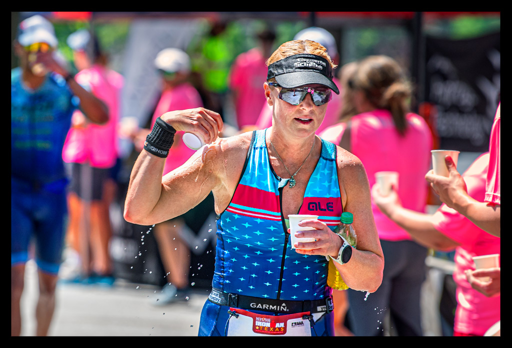 Es wurde etwas kühler, die Sonne begann, hinter den Häusern und Bäumen zu verschwinden. Die Schatten wurden länger. Aber was sich auf dem ersten Teil der dritten Runde der Ironman Texas Laufstrecke zunächst angenehm anfühlte, blieb dennoch ein Kampf bis zu den letzten Metern. Ich nahm die Eiswürfel, wie sie mir entgegen gereicht wurden. Ein Trinkbecher begleitete mich einige Kilometer, die zwischen den Verpflegungsstationen endlos schienen.
