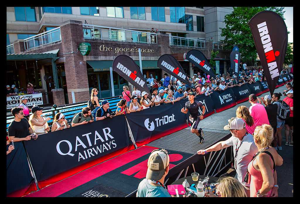 Nach stundenlangem Kampf mit mir bog ich endlich ein, um einen letzten Schlenker zu laufen, der mich auf die Zielgerade der Ironman Texas Laufstrecke brachte. Die finalen Meter waren inmitten der Athleten und Zuschauer unglaublich – all die jubelnden Menschen, die wehenden Fahnen und das riesige IRONMAN-Zieltor am Water Tower Square.