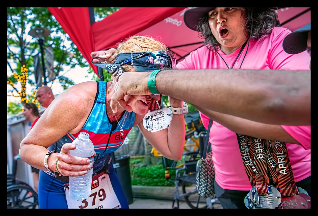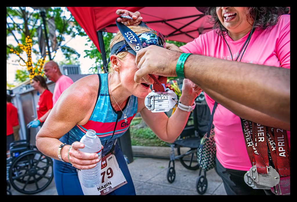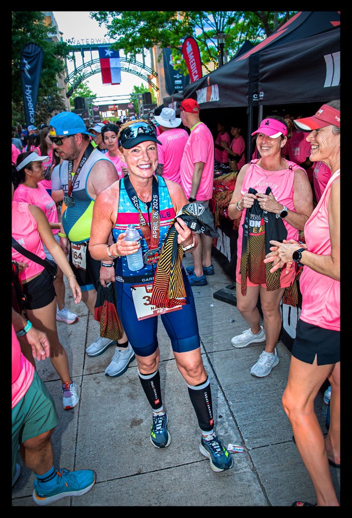 Es war sehr besonders, dass es noch so früh am Tag war und ich einige Zeit neben der Zielgeraden anderen Athleten zuschauen konnte, wie sie ins Ziel kamen. Die Amerikaner feiern einfach größer und in Texas gilt das noch mal mehr. Das gilt nicht nur für das unglaublich riesig erscheinende Ziel am Water Tower Square.