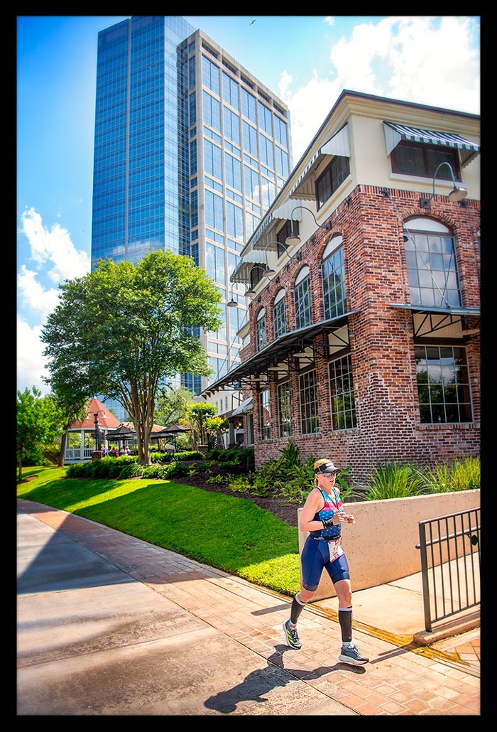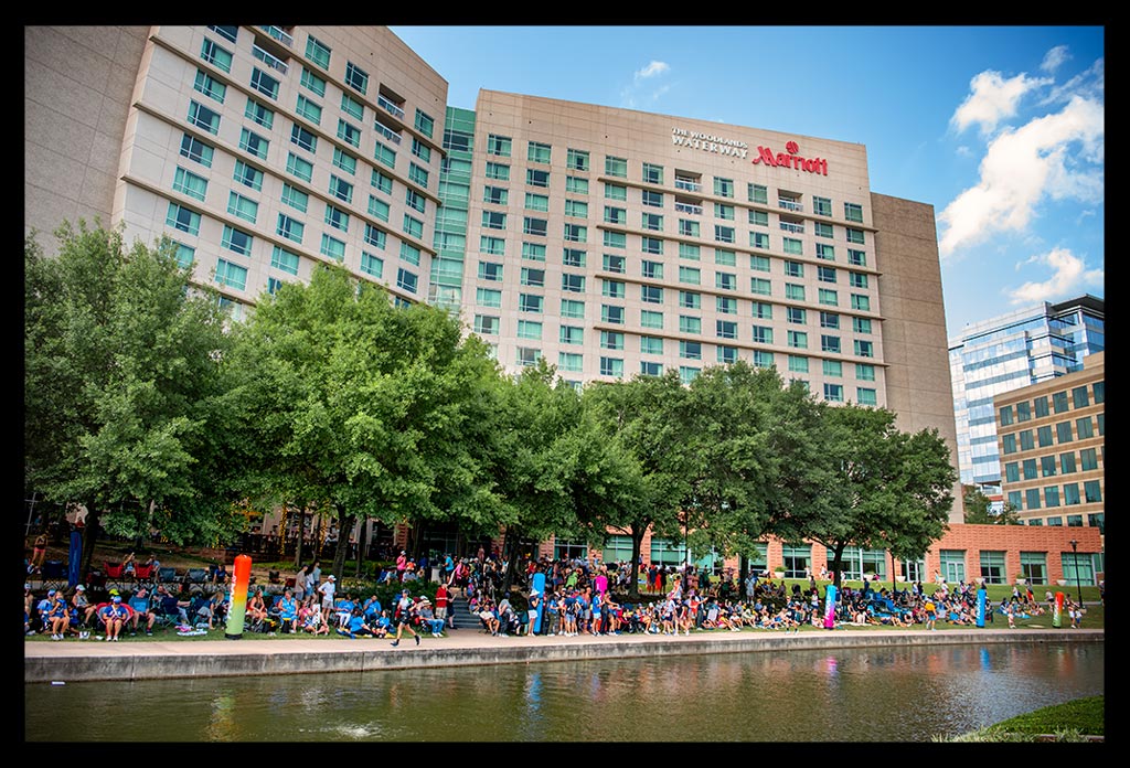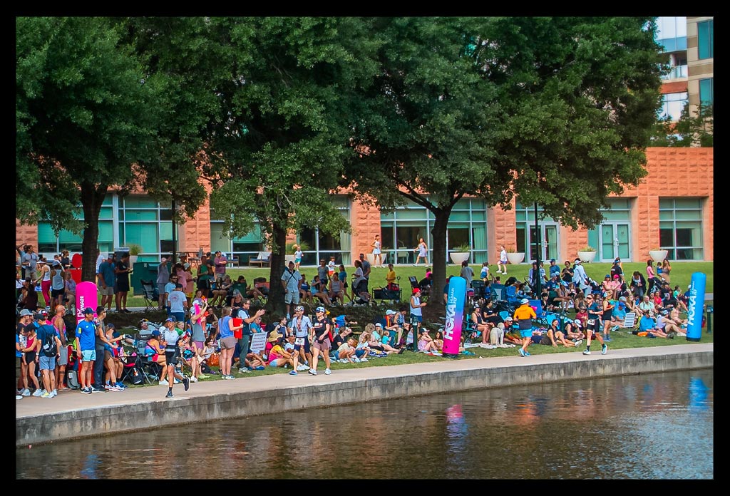 Nachdem wir den See umrundet hatten, ging es zurück zum Town Centre. Voller Zuschauer, besonders im Stadtkern am Kanal. Entlang des Kanals, in dem wir morgens noch entlang geschwommen waren. Es ist das Herz von The Woodlands, am Water Square entlang mit einigen Schleifen durch das Town Centre.