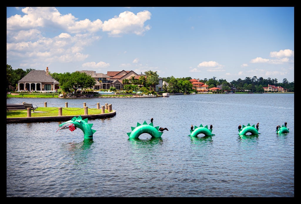 Weiter ging es hinüber zum Schwimmstart und daran vorbei. Immer wieder mit Stopps für ein Dixie. Dazwischen langen nicht enden wollende Fußwege, die zwischen Baumreihen in Siedlungen und neben Straßen entlang führten. Dabei lief ich durch eine wunderbare Gegend voller riesiger Häuser und Zäune, immer wieder mit Blick auf den Lake Woodlands.