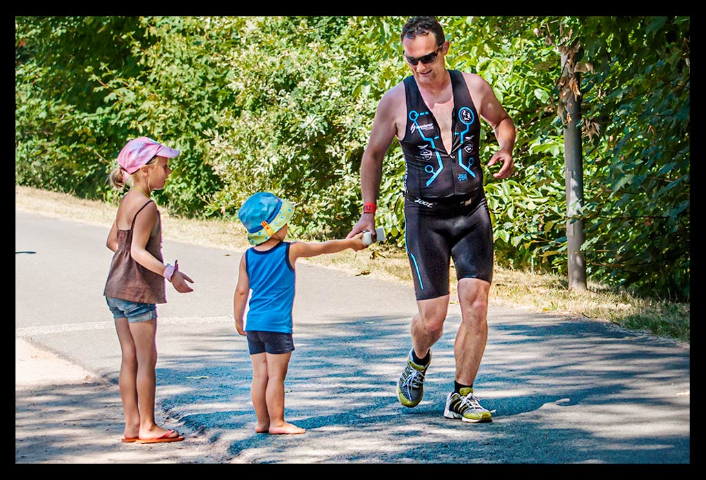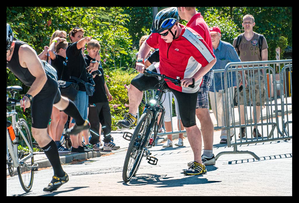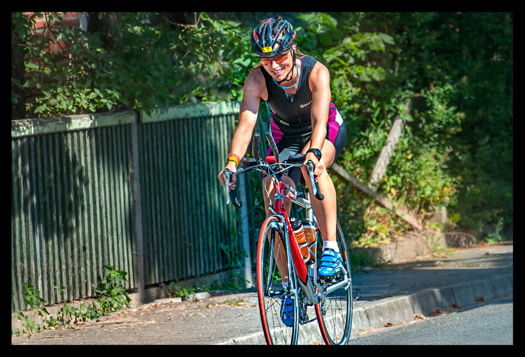 Am Start der Radstrecke stand dann schon unser Minifanclub bereit, der mich auch gut über den kurzen Anstieg in der ersten Kurve brachte. Da schießt einem direkt das gesamte Blut in die Oberschenkel. Was bin ich froh, als ich endlich einfach nur strampeln kann.
