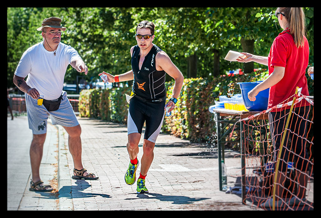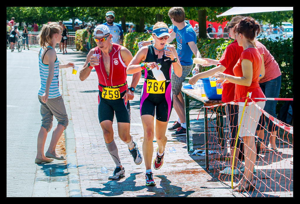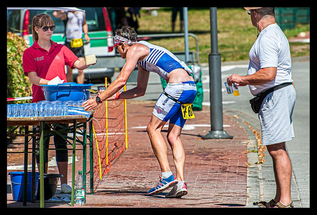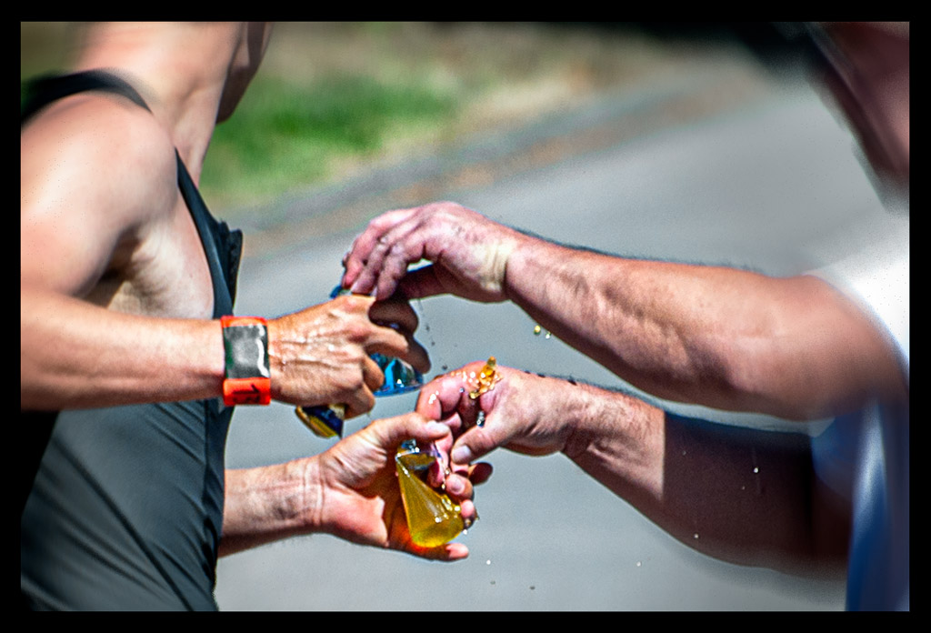 Kurz vor Peng sehe ich noch den Haltestreifen, der zum Absteigen ermahnt. Springe vom Rad, zerre selbiges über den Bordstein rauf auf den Rasen. Hampel zwischen denen herum, die gerade wechseln und in Windeseile stecke ich in den Laufschuhen. Ich eiere durch das Labyrinth der Absperrungen, strecke meinen Arm dem Messkasten entgegen und schon gibt es Wasser und Schwämme.