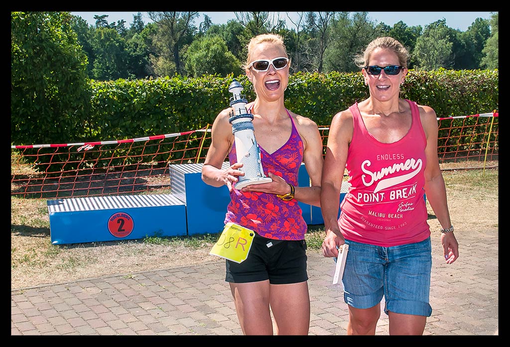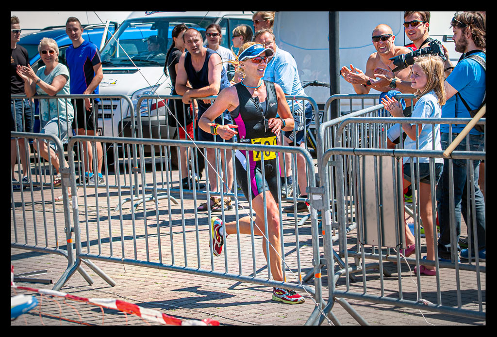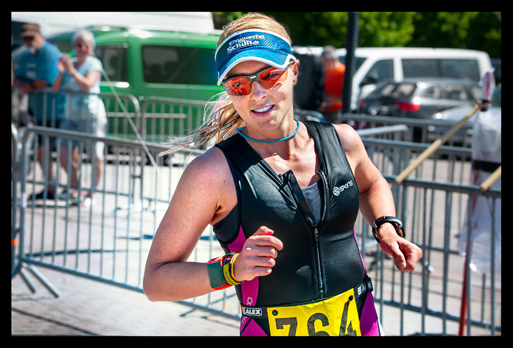 Das Ziel und einige Zuschauer taten sich auf. Ab durch den kleinen Bogen, mit dem Arm am Zeitmesskasten entlang gerutscht, Uhr aus, geschafft. Kurze Verwirrung – erste oder zweite oder was nun? Scheinbar waren die ganze Zeit Staffelläuferinnen vor mir, die sich einfach im Wasser, auf dem Rad und der Laufstrecke unglaublich ähnlich sahen… Das Ärgernis des nicht Heranlaufenkönnens war schnell vergessen, als ich hörte, dass ich tatsächlich gewonnen habe!