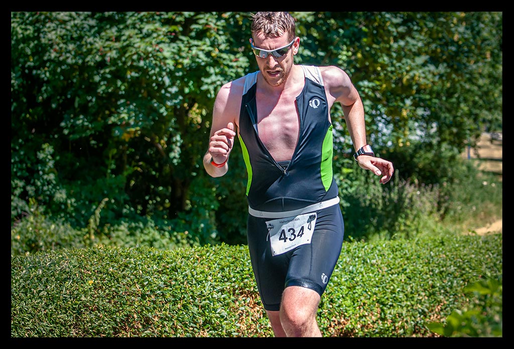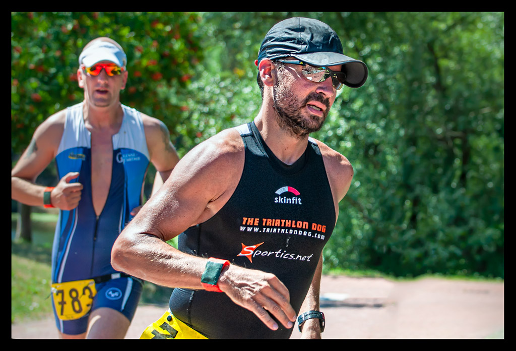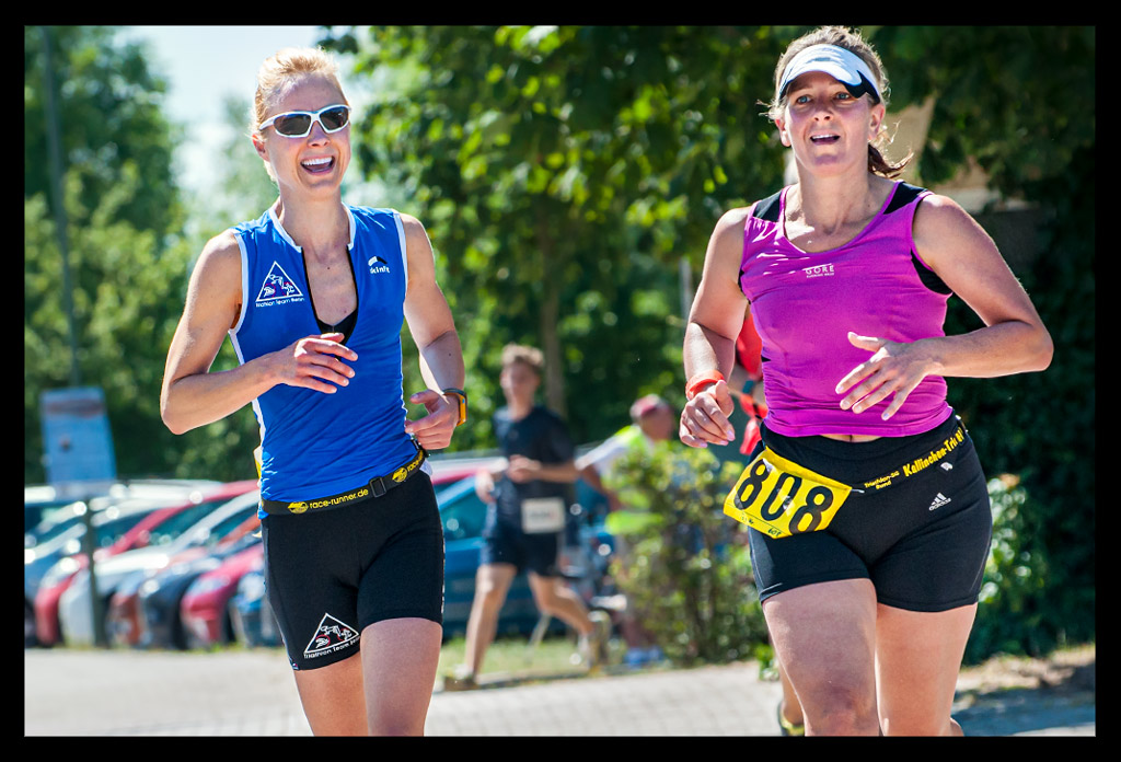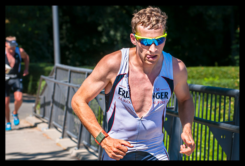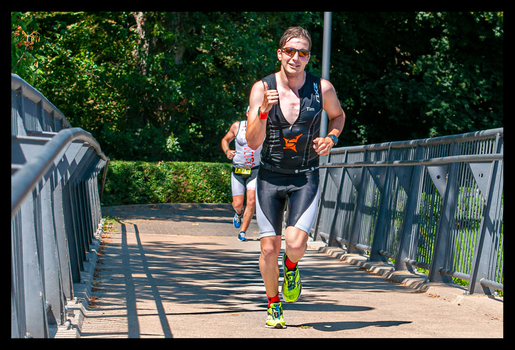 Im Zick Zack ging es an der Wechselzone vorbei in die nächste Runde. Immer schön bergan. Wer aus den Bergen kam, hat sicher keinen Anstieg gesehen und alles so platt wie Dänemark eingeschätzt. Ich hingegen kämpfte mich die Anhöhen hoch. Viel Anstrengender waren aber die bergab Passagen. Obwohl – das Ufer mit gleißender Sonne hatte es auch in sich. StrongmanRun Gewinner Tom schwebt dort auf einmal an mir vorbei. Bevor ich verstehen kann, was er sagt, ist er längst außer Reichweite. Der nächste ist Tim, der seine letzte Runde angeht, während ich ihn Anjammere und erst meine dritte starte.