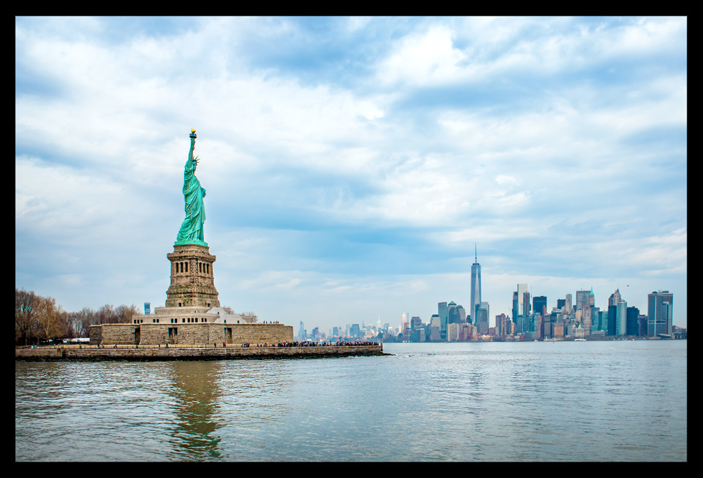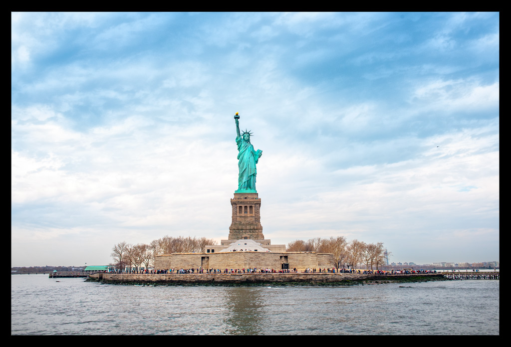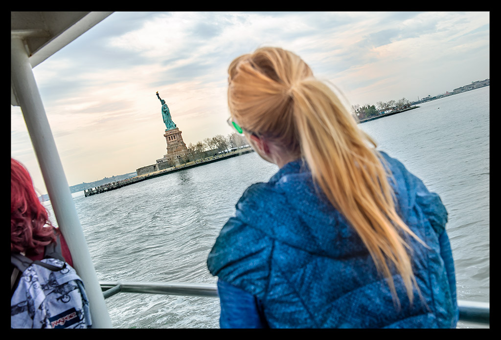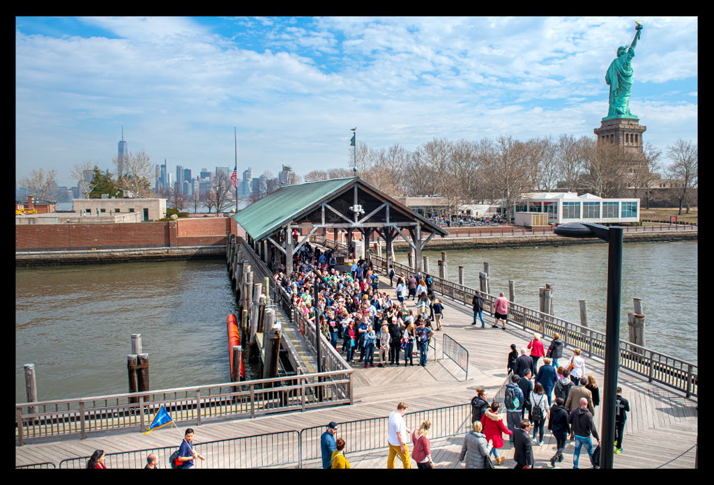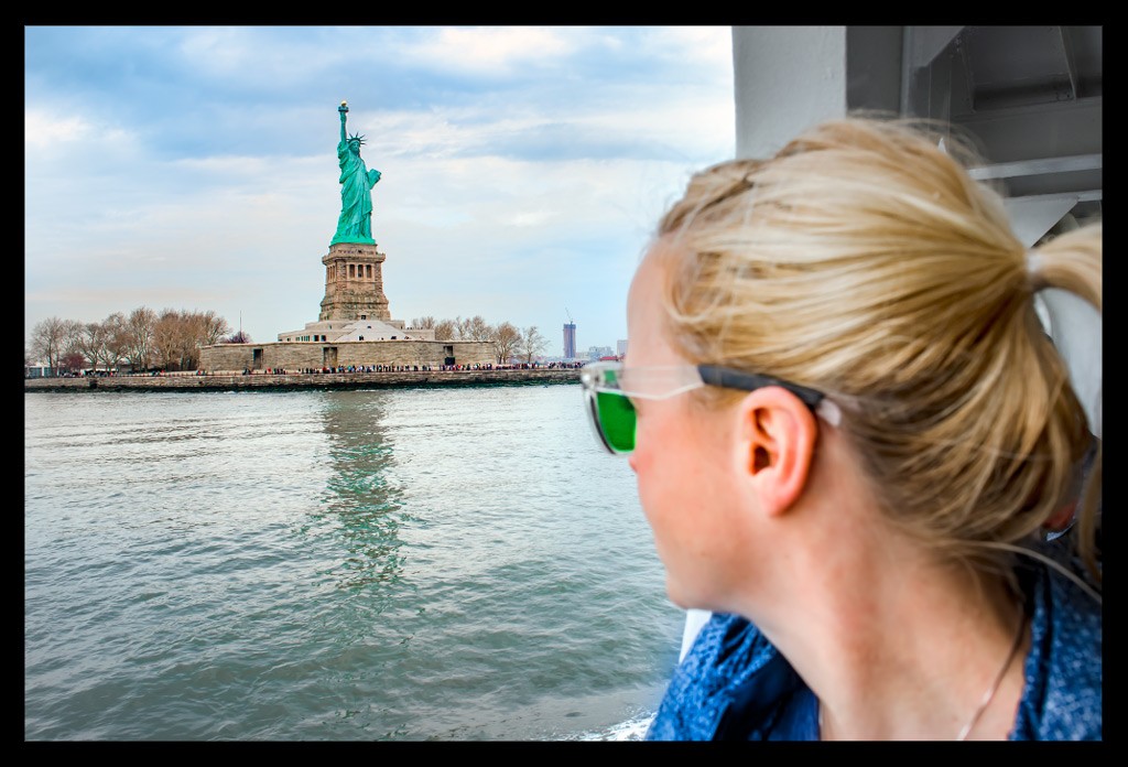 Von der Südspitze Manhattans legte die Fähre nach wenigen Minuten ab und machte sich auf den Weg durch den New Yorker Hafen. Die Überfahrt im strahlenden Sonnenschein dauerte einige Minuten. Die Skyline schrumpfte mit jedem Meter und die Dame mit ihrem grünlichen Gewand wurde größer und größer.