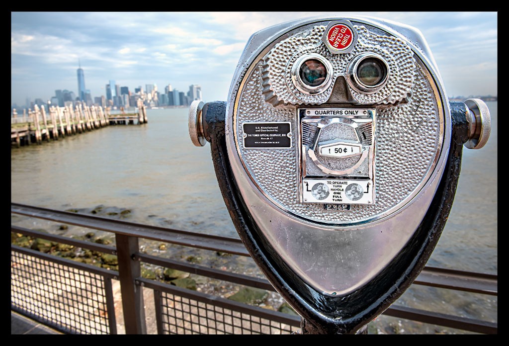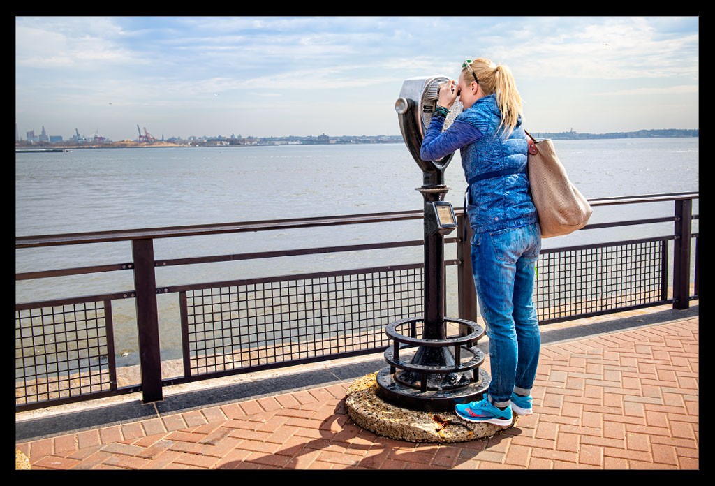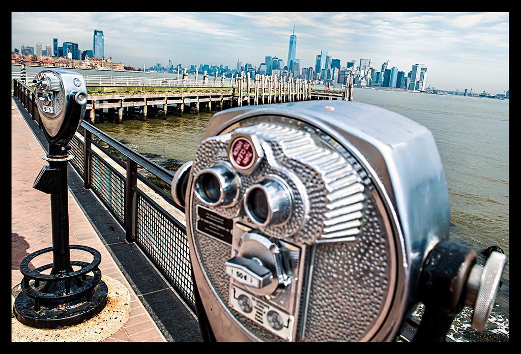 Vom Rande der Insel konnte ich rüber nach links zu Ellis Island schauen und leicht rechts die Glasfassaden der Skyline im Sonnenschein glitzern sehen. Beeindruckend. Bis jetzt hatte ich die Formation der Wolkenkratzer nur von Brooklyn aus so schön sehen können. Das musste ich mir mit einem dieser Touri-Fernrohre dennoch genauer anschauen! Ich genoss einfach diesen sagenhaften Anblick. Das musste ich erst einmal auf mich wirken lassen. Die Skyline, die Statue, die Dimension, der Ausblick, die Geschichte, New York,…