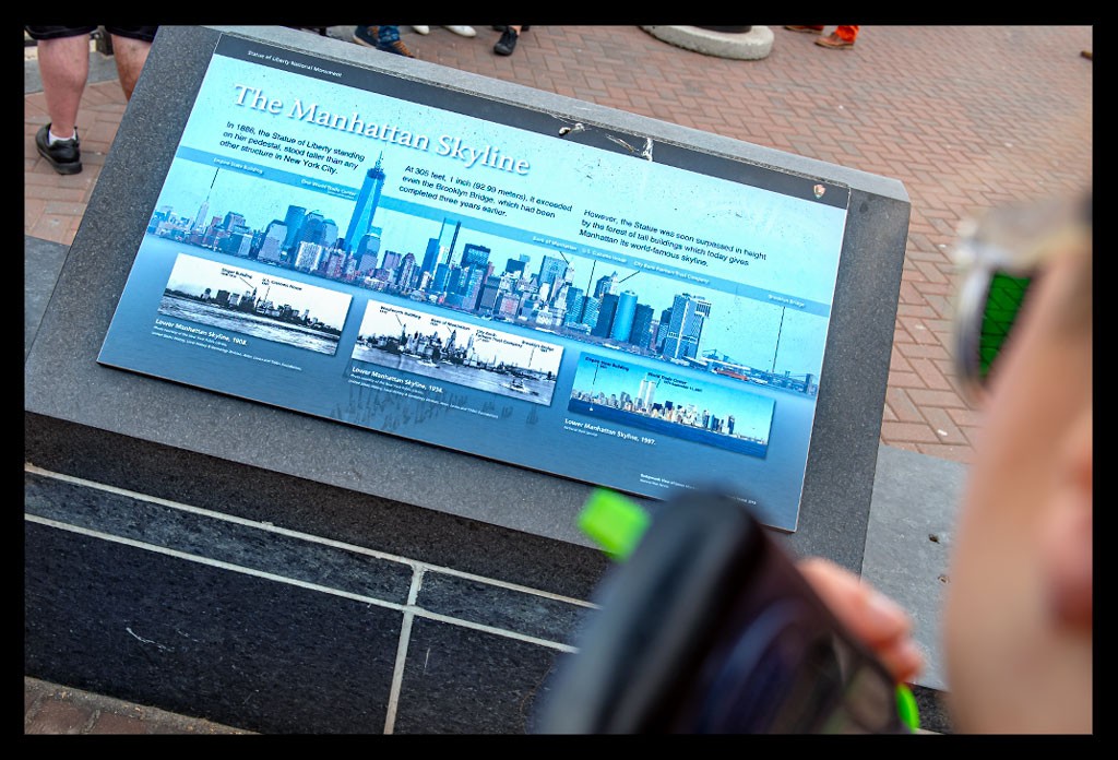 Es schlenderten bereits so einige Gäste über die Insel und lauschten der Tour. Ich begann meinen Rundgang und kann neben der elektronischen Einführung auch selbst einige Informationstafeln lesen. Ich bin letztlich doch überwältigt, wie groß die Insel und der Sockel sind. Die Schlange vor dem Sockel wirkte endlos und ich war etwas froh, dass ich mich nicht anstellen musste. Ich lief in die falsche Richtung, klickte mich also munter rückwärts durch die Informationen und entspannte mich zunächst bei der Ruhe hinter der Statue, die mit ihrem Rücken zu mir thronte.