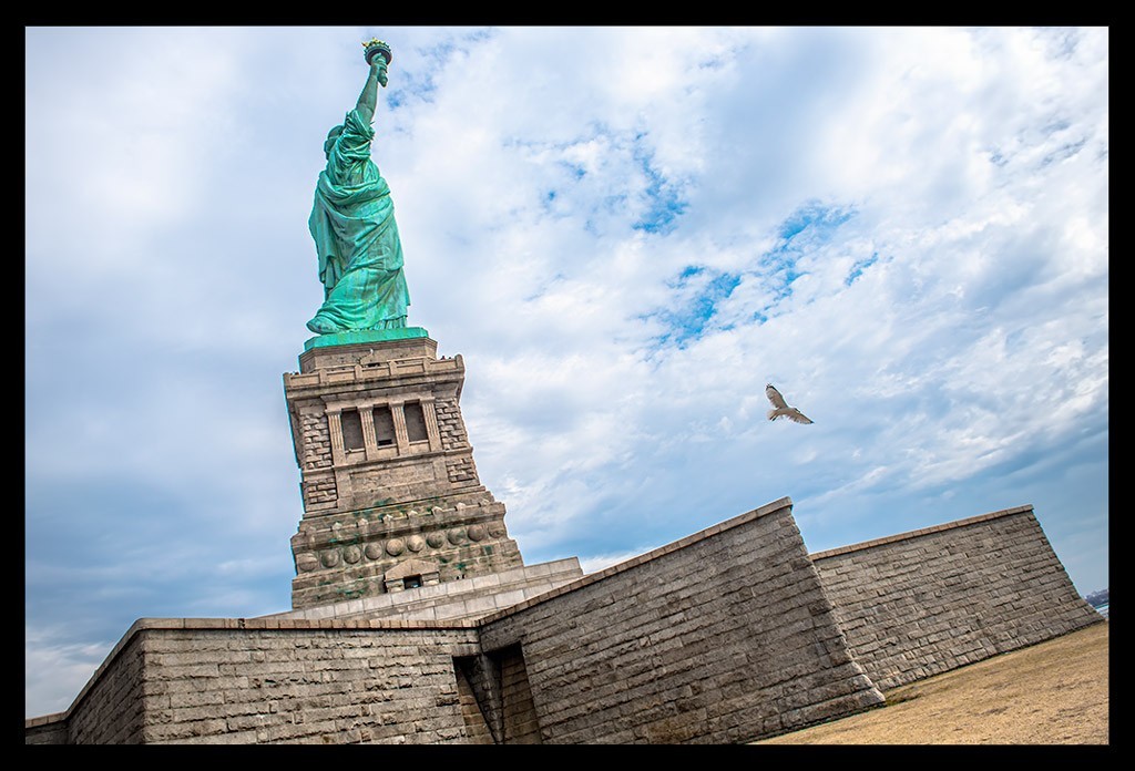 Umso näher ich kam, desto massiver wirkte die Lady vor unserem Schiff. Sie ist nicht so groß, wie ich sie mit ihren 46 Metern erwartet hatte. Der Schein trügt aber. Mit dem Sockel erreicht dieses Wahrzeichen New Yorks eine Höhe von 93m und scheint von dort aus über die Stadt wachen zu wollen. Vor Jahrzehnten hieß sie Einwanderer willkommen.