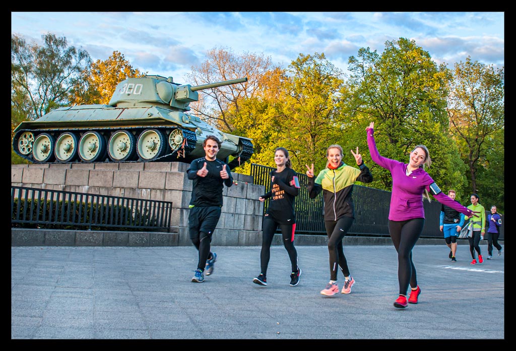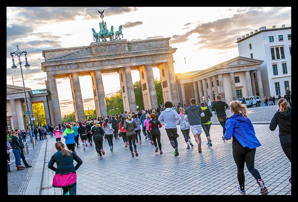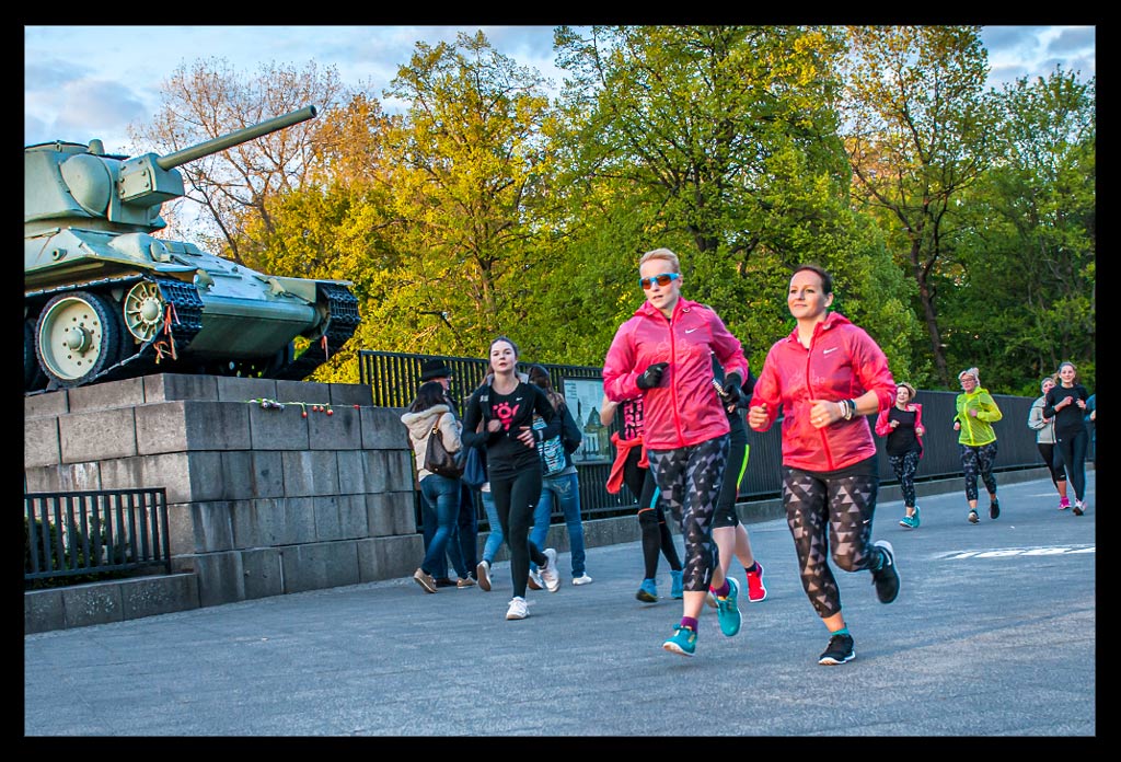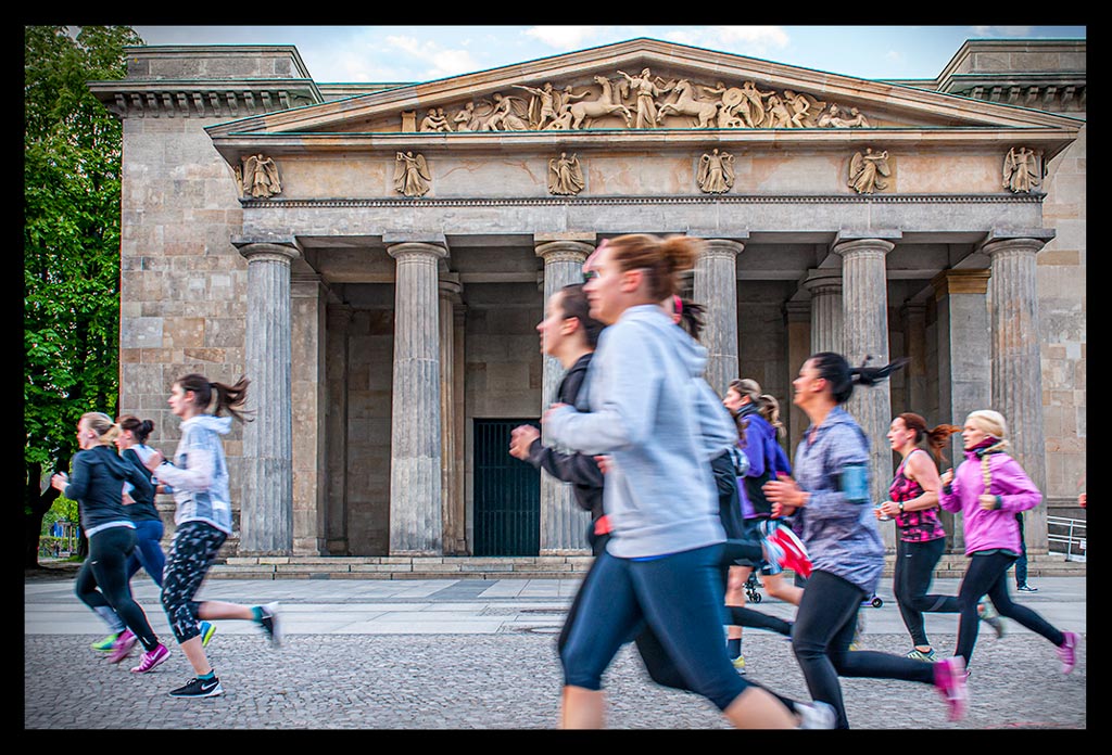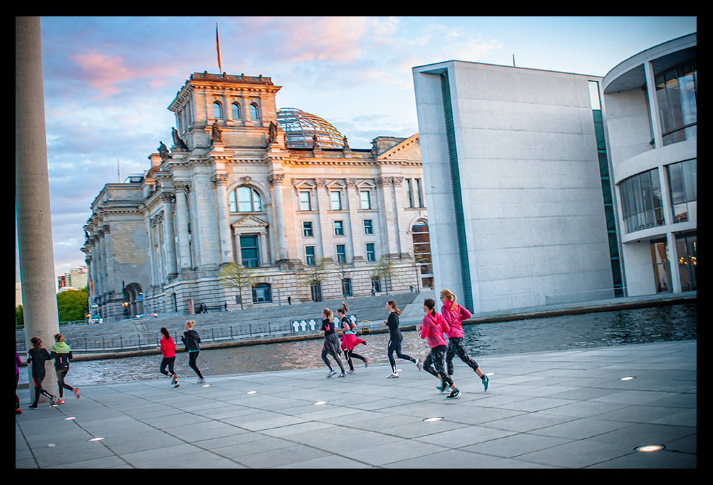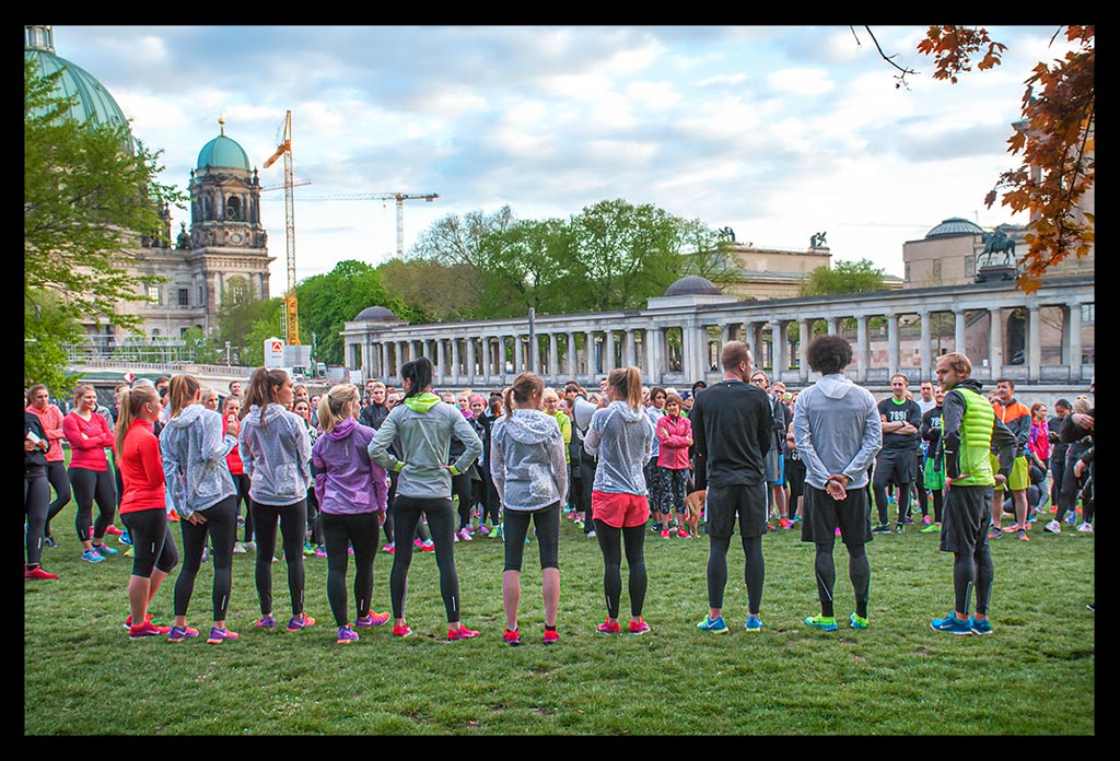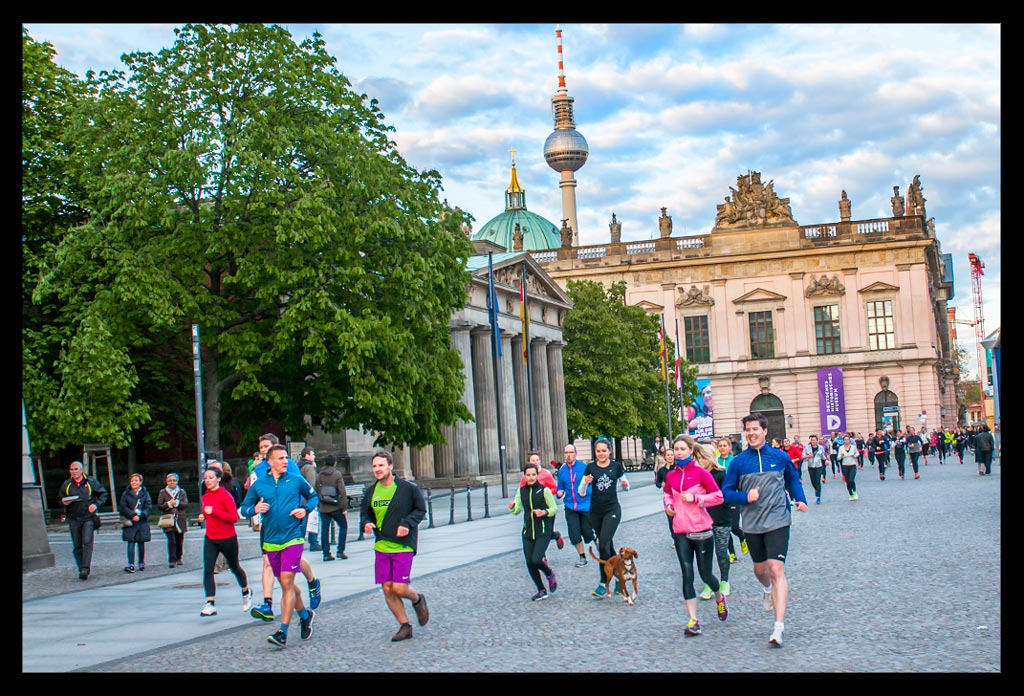 Bevor die Sonne aber ganz verschwunden war, zogen wir unsere Schnürsenkel fest und liefen zu einer kleinen Erwärmung zum Monbijoupark an das Spreeufer. Im Rücken ragte der Berliner Dom empor, dessen Sandstein im letzten Sonnenlicht gelblich schimmerte. Um uns herum tiefe Schatten der Kastanienbäume, die das Ufer säumen. Der anschließende acht Kilometer Lauf bis zum Brandenburger Tor, durch das Regierungsviertel und entlang der Spree verging mit den rund 200 Läufern wie im Flug.