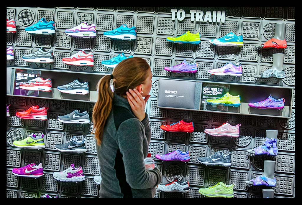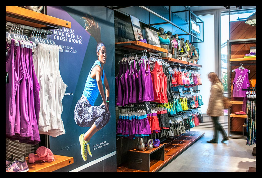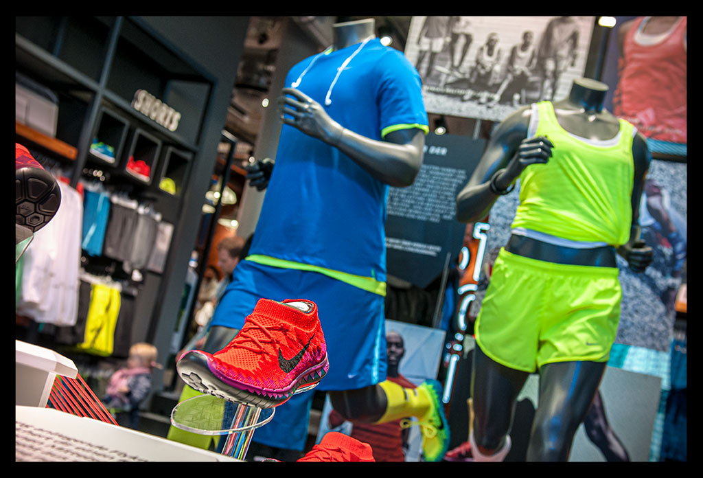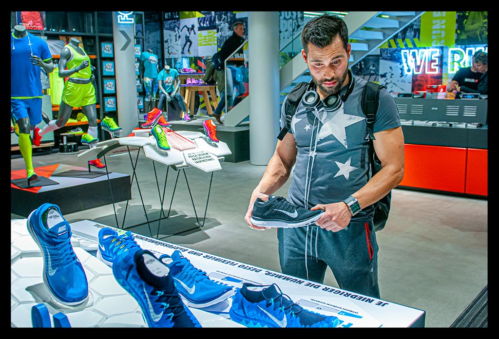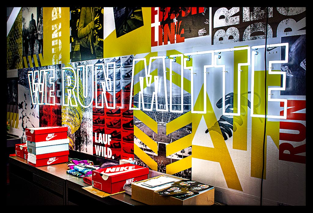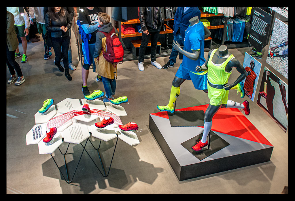 In der hohen Glasfassade des neuen ‚Nike Mitte‘ spiegelt sich die Spätnachmittagssonne, die zugleich das Geschäft hell erleuchtet. Auf zwei Etagen gibt es viel Raum für allerlei Trainingsbekleidung und technisches Zubehör.