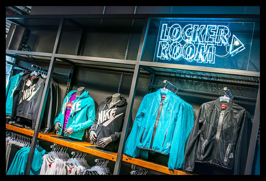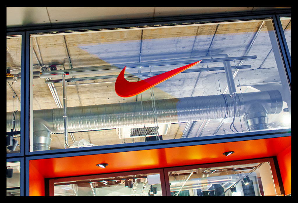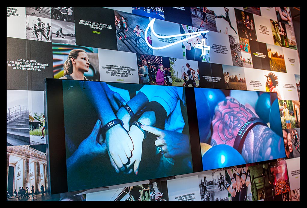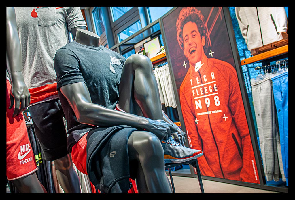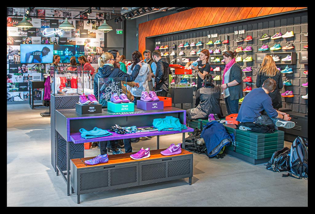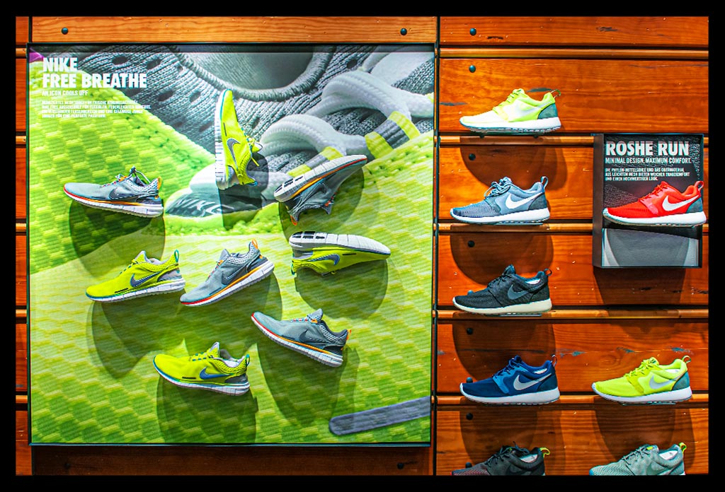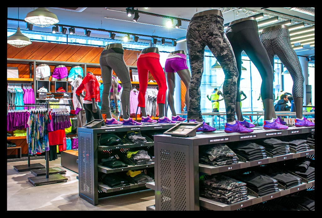 In der hohen Glasfassade des neuen ‚Nike Mitte‘ spiegelt sich die Spätnachmittagssonne, die zugleich das Geschäft hell erleuchtet. Auf zwei Etagen gibt es viel Raum für allerlei Trainingsbekleidung und technisches Zubehör.