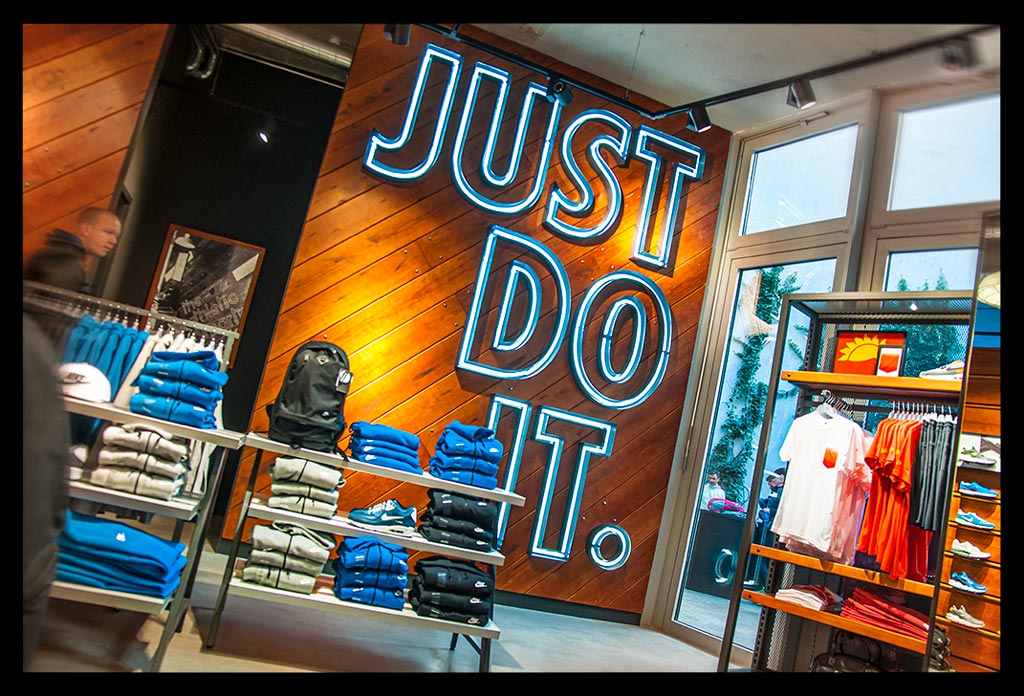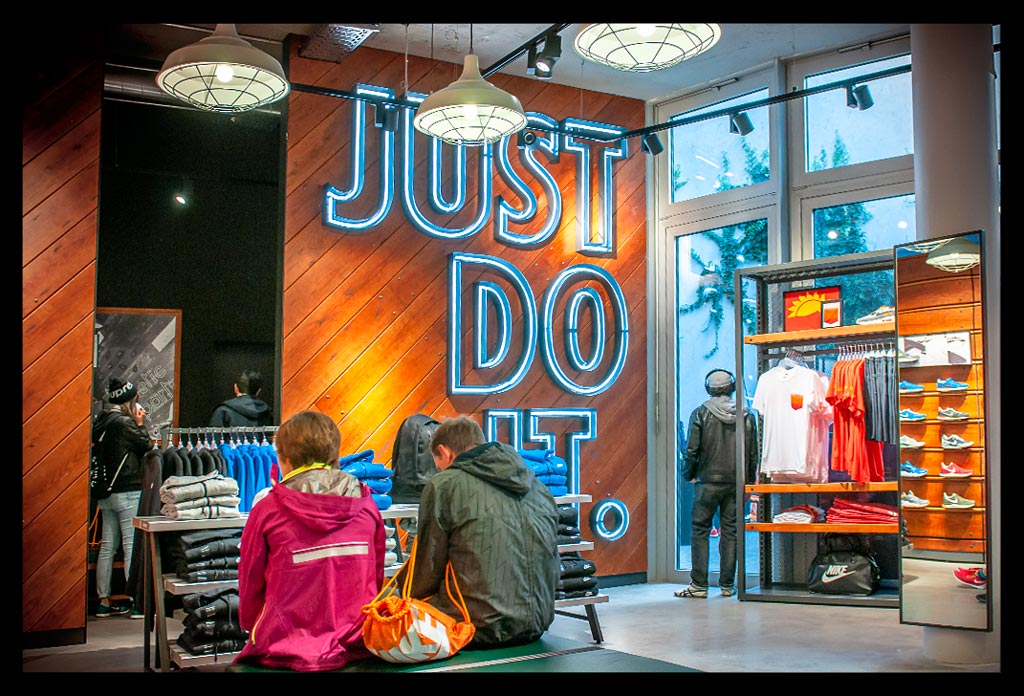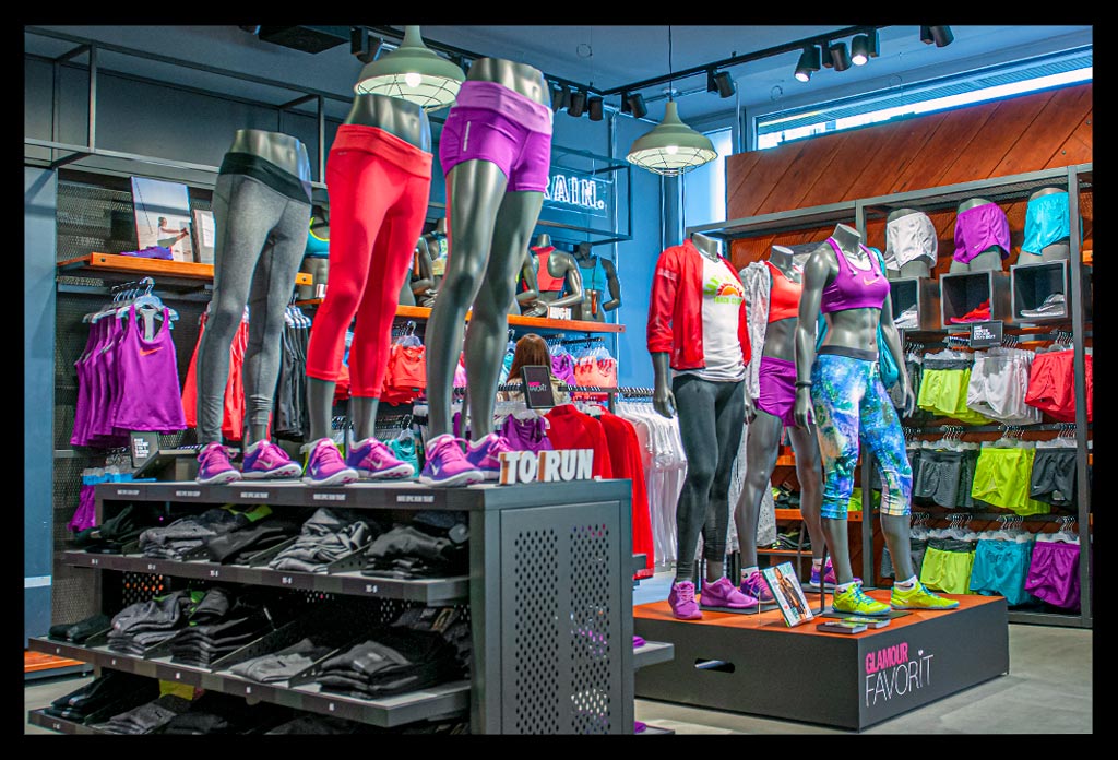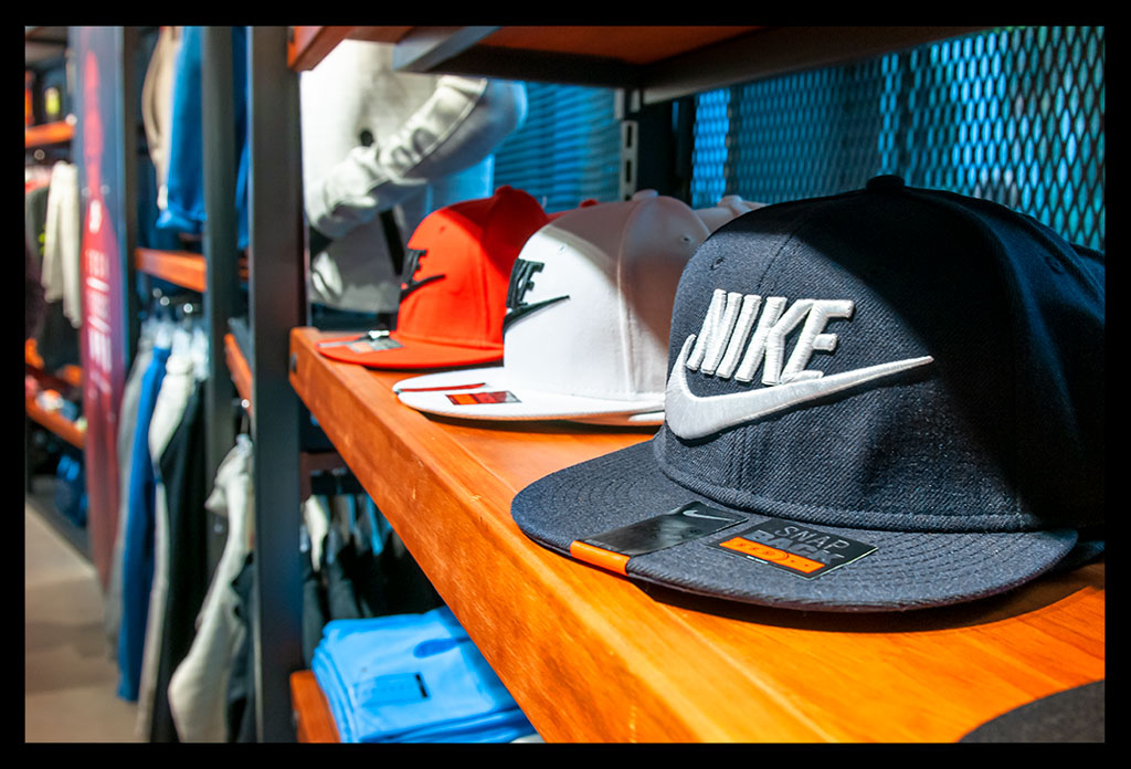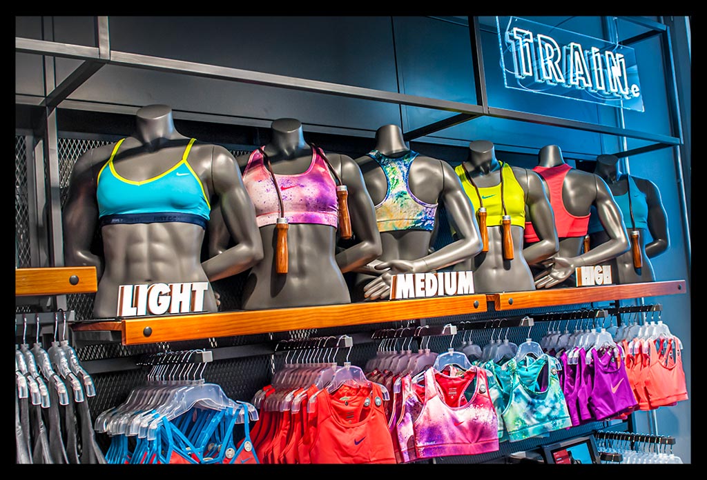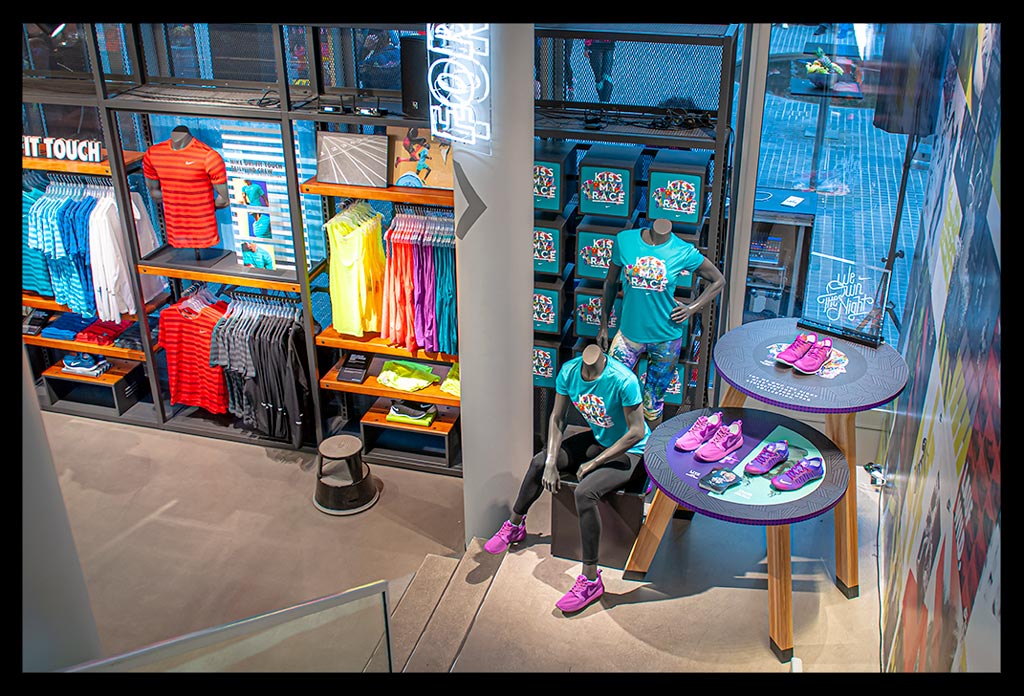 In der hohen Glasfassade des neuen ‚Nike Mitte‘ spiegelt sich die Spätnachmittagssonne, die zugleich das Geschäft hell erleuchtet. Auf zwei Etagen gibt es viel Raum für allerlei Trainingsbekleidung und technisches Zubehör.
