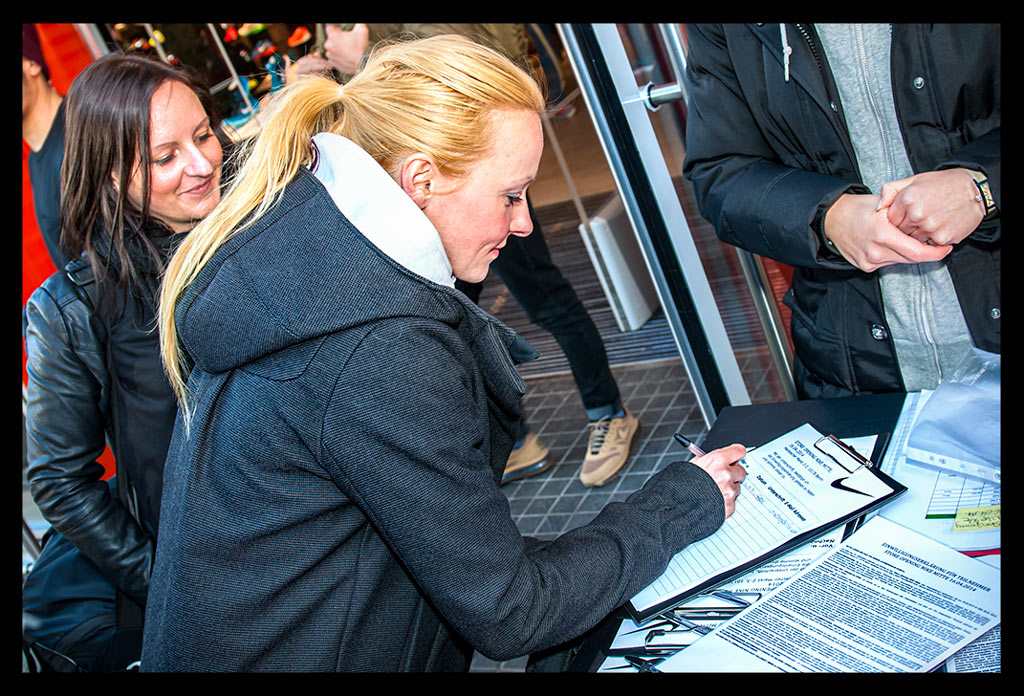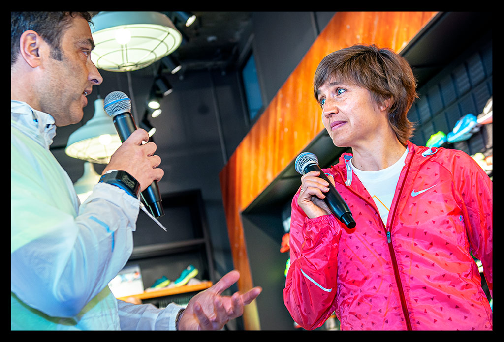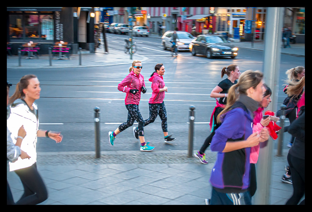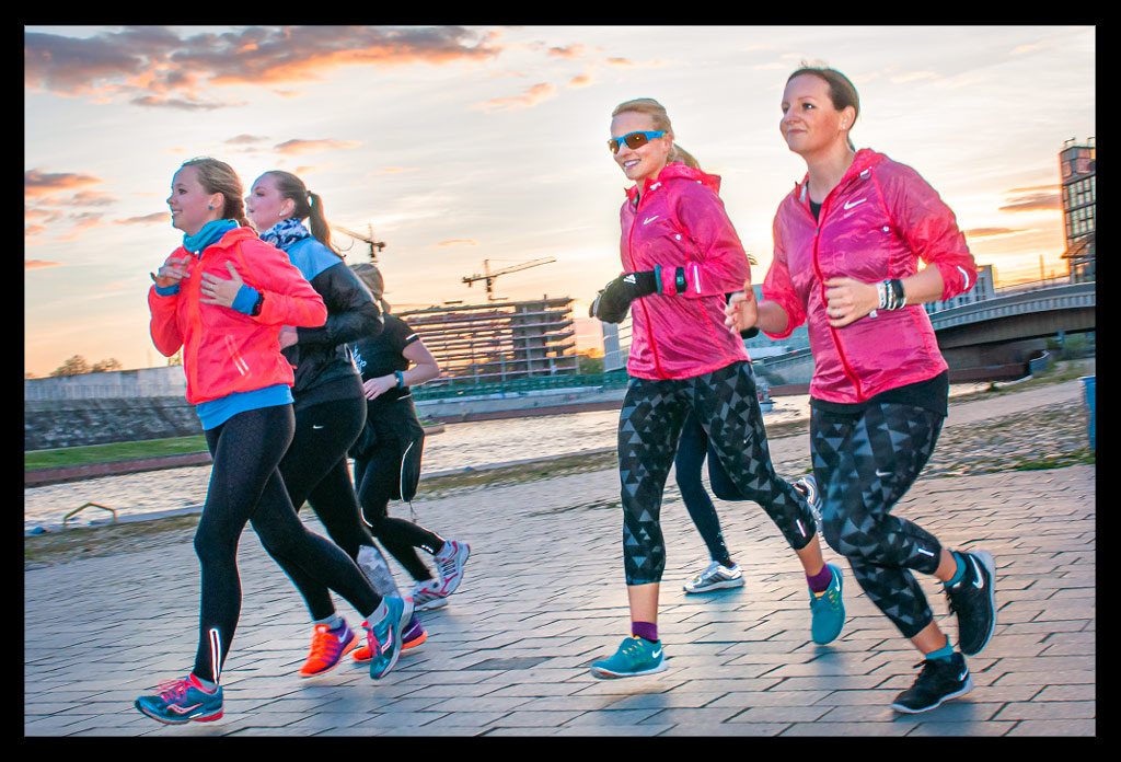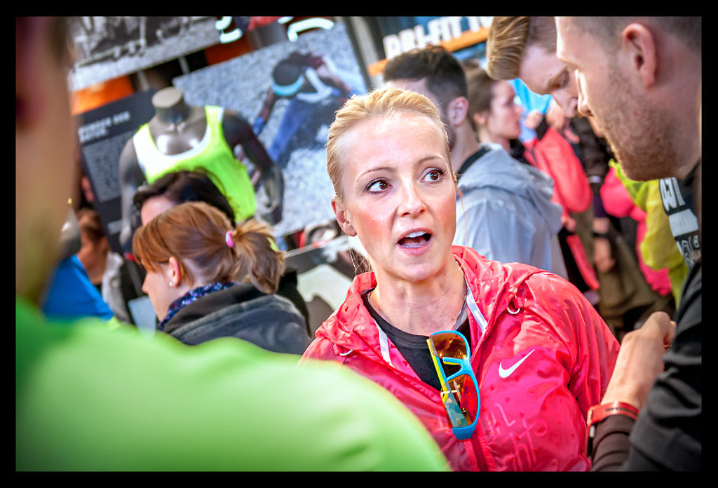 Bevor es aber an diesem wunderbar milden Nachmittag mit überraschend viel Sonne zum Lauf durch die Stadt losgehen konnte, begrüßte uns Marathonläuferin Irina Mikitenko. Sie hatte sich vorher schon unter uns Hobby Läufer gemischt und sich das Geschäft ganz zwanglos näher angeschaut. Ganz fan-nah und locker, wie wir auch durch den Laden geschlendert sind. Eine unglaublich sympathische und natürlich unfassbar erfolgreiche Läuferin. Schade, dass ich sie im Anschluss nicht mehr für ein kleines Interview erwischen konnte.