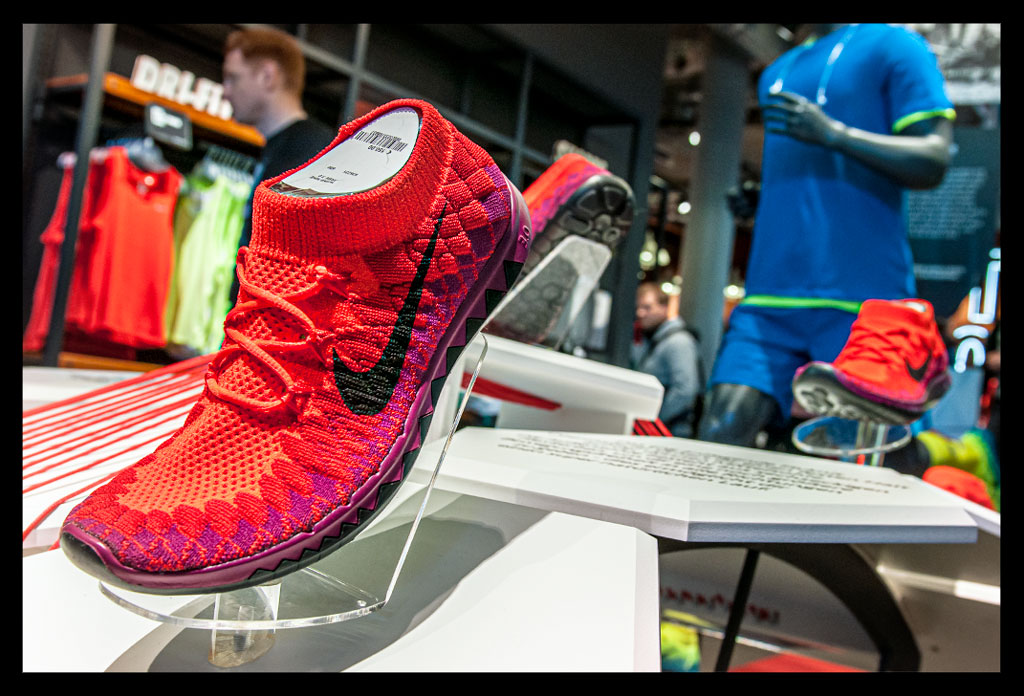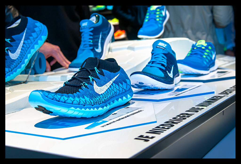 Natürlich konnten wir uns von der gesamten Free Kollektion einen Eindruck verschaffen, die seit ihrer Markteinführung 2004 ihre größte Weiterentwicklung erlebt. Die sechseckigen Flexkerben sorgen bei den drei Modellen, Nike Free 3.0 Flyknit, Free 4.0 Flyknit und Nike Free 5.0, für eine besonders hohe Flexibilität. Die abgerundete Laufsohle im Fersenbereich verbessert das Abrollgefühl für alle Fersenläufer. Das Flyknit Obermaterial sorgt nicht nur für eine gute Atmungsaktivität sondern Dank des Stretchmaterials gleichzeitig für eine angenehme Passform, für guten Halt und Stabilität. Der 5.0 ist auch als 5.0 Breath zu haben, der durch sein extrem leichtes und luftdurchlässiges Obermaterial noch einmal um einiges atmungsaktiver ist. Natürlich sind auch all diese Modelle als iD Version verfügbar. Also nichts wie ran an einen selbst designten Schuh.